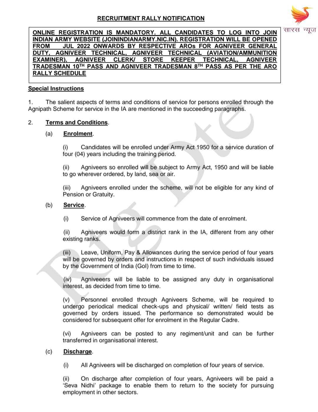 Post Views: 377 सारस न्युज एजेंसी, नई दिल्ली। भारतीय सेना ने अग्निवीर भर्ती रैली के लिए सोमवार को अधिसूचना जारी…