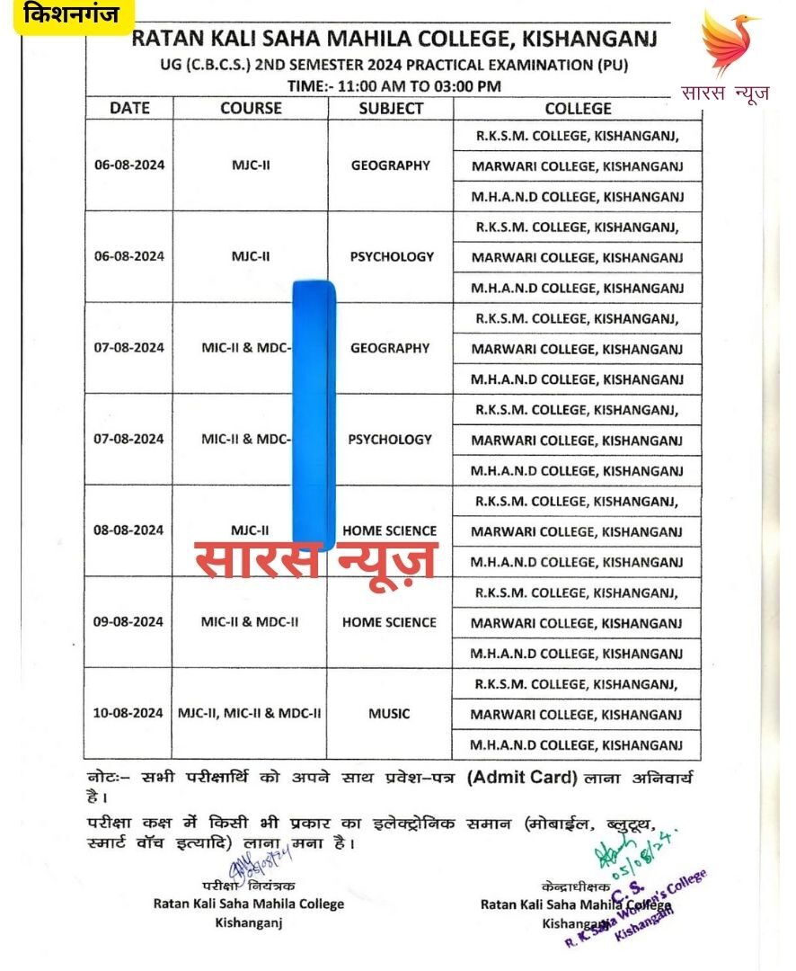 Read MorePost Views: 251 सारस न्यूज़, वेब डेस्क। आरकेएस महिला कॉलेज किशनगंज की द्वितीय सेमेस्टर प्रायोगिक परीक्षा 2024 का कार्यक्रम घोषित…