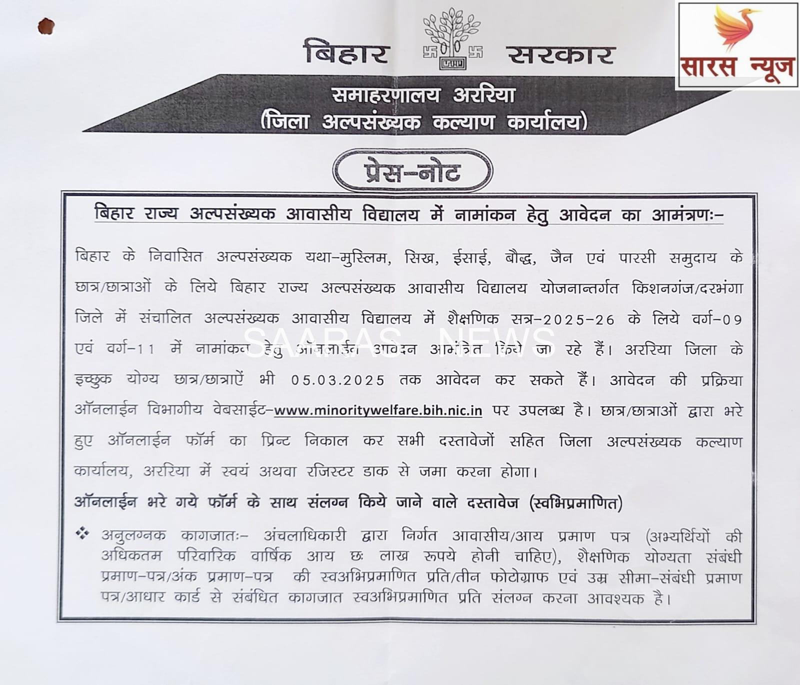 Post Views: 442 प्रतिनिधि, सारस न्यूज़, अररिया। बिहार राज्य अल्पसंख्यक आवासीय विद्यालय योजना के तहत अल्पसंख्यक समुदाय के छात्रों के…