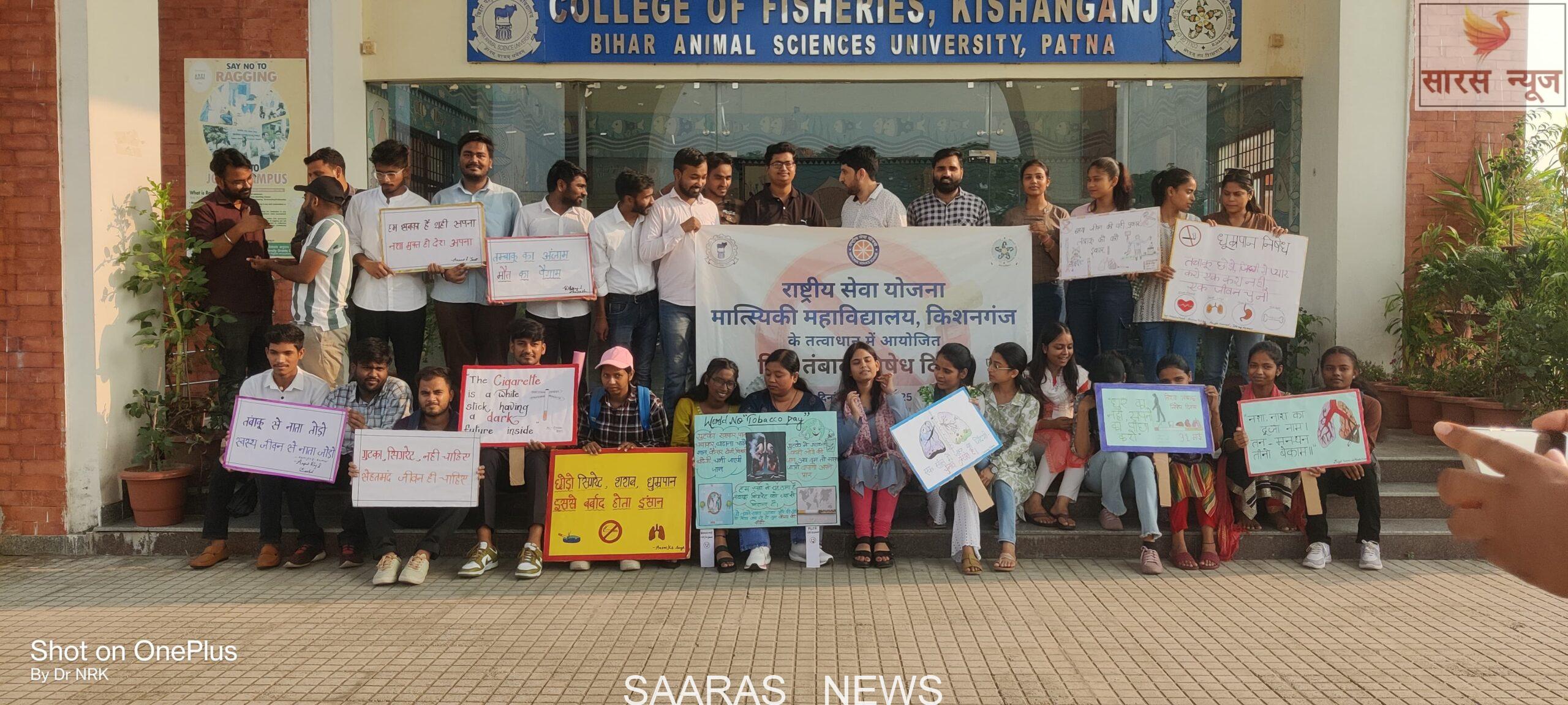 नो टॉबैको डे पर मात्स्यिकी महाविद्यालय किशनगंज में जन-जागरूकता रैली का आयोजन।