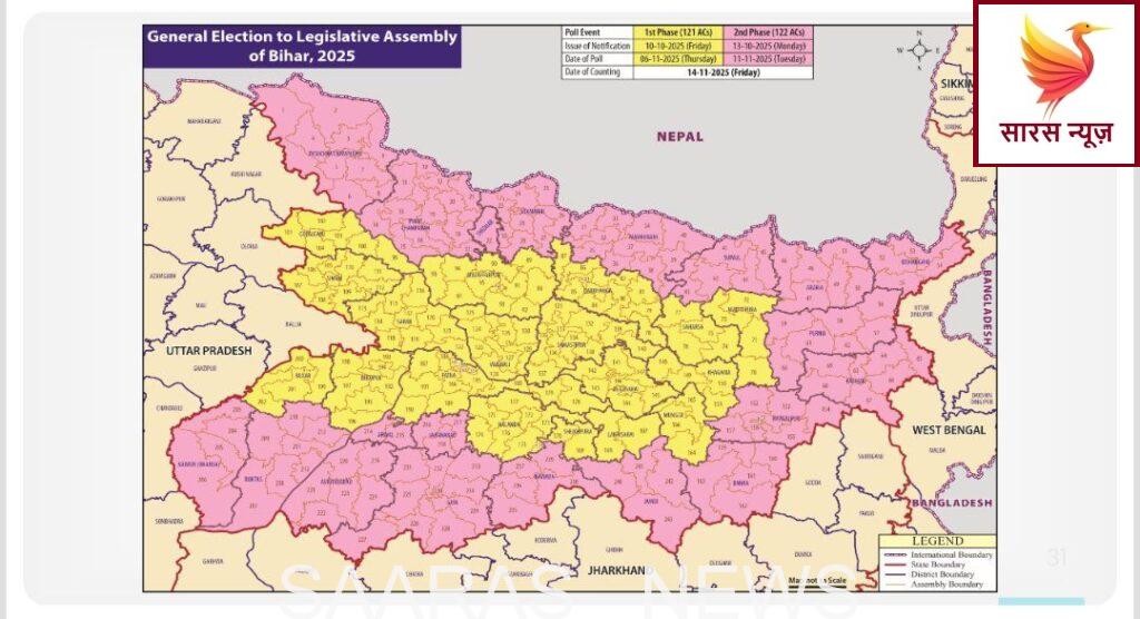 बिहार विधानसभा चुनाव की तारीखों का ऐलान, दो चरणों में होगा मतदान – 14 नवंबर को आएगा नतीजा।