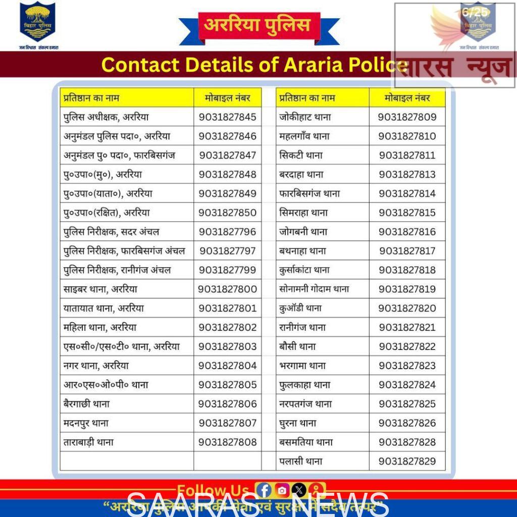 अररिया जिले के वरीय पदाधिकारी और थानों के नए मोबाइल नंबर इस प्रकार हैं:
