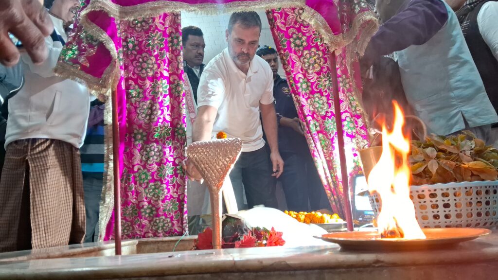 भारत जोड़ो न्याय यात्रा के दौरान सोमवार को राहुल गांधी विश्व प्रसिद्ध मां खड्गेश्वरी महाकाली मंदिर पहुंचें, जहां राहुल गांधी ने मां खड्गेश्वरी महाकाली की आरती कर व बाबा खड्गेश्वरनाथ पर जलाभिषेक कर देश की सुख समृद्धि की कामना की। इस दौरान मां खड्गेश्वरी महाकाली व बाबा खड्गेश्वरनाथ महादेव का जयकारा लगाया गया। मां खड्गेश्वरी के साधक नानू बाबा के द्वारा राहुल गांधी को चुनरी व माला पहनाकर उनका स्वागत किया गया। वहीं राहुल गांधी के द्वारा सबसे पहले मां खड्गेश्वरी पर पुष्प व चुनरी चढ़ाई गई। इसके बाद मां खड्गेश्वरी की आरती की गई। वहीं बाबा खड्गेश्वरनाथ महादेव पर जलाभिषेक किया गया। मां खड्गेश्वरी महाकाली के साधक नानू बाबा के द्वारा मां खड्गेश्वरी की तस्वीर और हेमंत कुमार हीरा के द्वारा लिखित मां खड्गेश्वरी की पुस्तक राहुल गांधी को भेंट स्वरूप दिया गया।