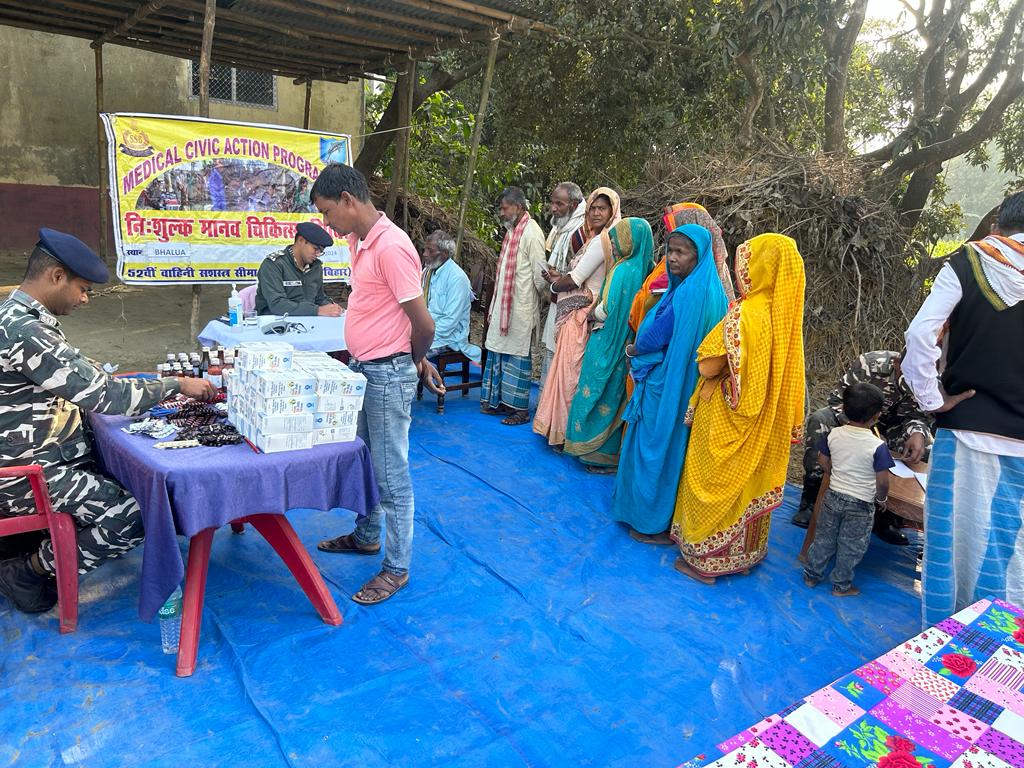 भारत सरकार के तत्वाधान में एसएसबी 52 वीं वाहिनी के कमांडेंट महेंद्र प्रताप कमांडेंट 52 वाहिनी सशस्त्र सीमा बल अररिया के निर्देशन में नागरिक कल्याण कार्यक्रम के तहत सीमा चौकी भलुआ स्थित गरैया वार्ड संख्या 05 में नि:शुल्क मानव चिकित्सा शिविर कार्यक्रम का आयोजन किया गया। जिसमें 52 वीं वाहिनी के चिकित्सा पदाधिकारी डॉ मनोज जाट के द्वारा स्थानीय नागरिकों को जांच के बाद उन्हें दवाइयों का वितरण किया गया। इस शिविर में 36 पुरुष, 42 महिला व 08 बच्चे कुल 86 मरीजों का इलाज किया गया है। साथ ही डॉ मनोज जाट द्वारा स्थानीय लोगों को खान-पान, खुद की साफ-सफाई, नशा को छुड़ाने के लिए परिवारजनों को जागरूक करने व बेटी बचाओ बेटी पढ़ाओ के प्रति भी स्थानीय लोगों को जागरूक किया गया।