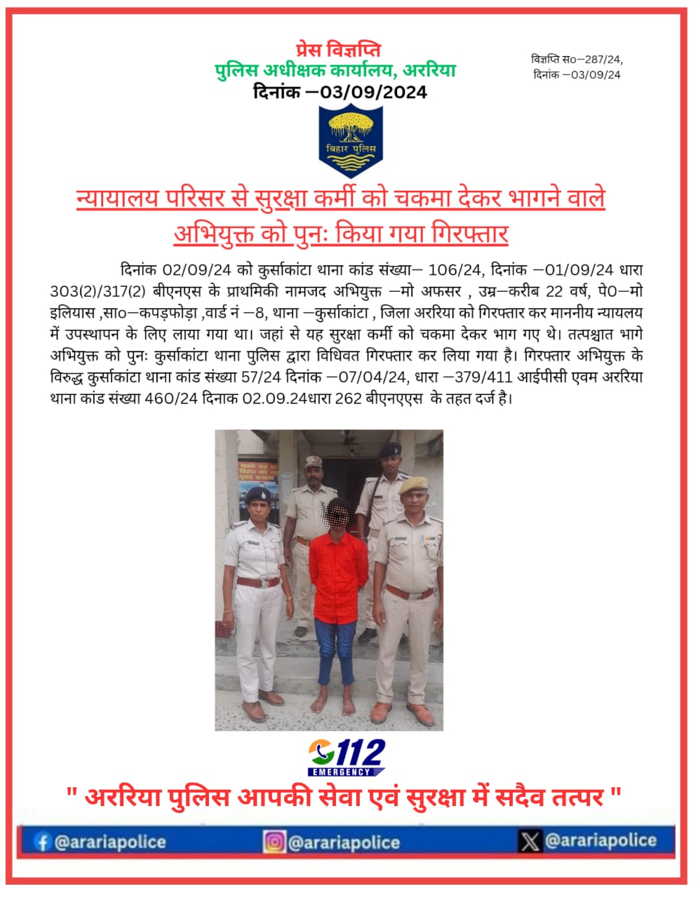 व्यवहार न्यायालय में लाए गए पेशी के दौरान कुर्साकांटा निवासी एक आरोपी सुरक्षा कर्मी को चकमा देकर 02 सितंबर को कोर्ट परिसर से फरार होने में सफल रहा, जिसकी गिरफ्तारी पुनः कर ली गई है। इसको लेकर एसपी कार्यालय से प्रेस विज्ञप्ति जारी कर जानकारी दी गई है। बताया गया है कि कुर्साकांटा थाना में 01 सितंबर को दर्ज प्राथमिकी कांड संख्या 106/24 के तहत धारा 303(2)/317(2) बीएनएस के प्राथमिकी नामजद आरोपी कपड़फोड़ा वार्ड संख्या 08 के मो. अफसर (22), पिता मो. इलियास को गिरफ्तार कर व्यवहार न्यायालय में उपस्थापन के लिए 02 सितंबर को लाया गया था, जहां से उक्त आरोपी सुरक्षा कर्मी को चकमा देकर फरार हो गया। इसके बाद फरार आरोपी को पुनः कुर्साकांटा थाना पुलिस द्वारा विधिवत गिरफ्तार कर लिया गया है।गिरफ्तार अभियुक्त के विरुद्ध कुर्साकांटा थाना में गत 07 अप्रैल को दर्ज प्राथमिकी कांड संख्या 57/24 धारा 379/411 आइपीसी पूर्व से दर्ज है। वहीं नगर थाना क्षेत्र स्थित व्यवहार न्यायालय में आरोपी के फरार होने पर अररिया नगर थाना में 02 सितंबर को कांड संख्या 460/24 के तहत प्राथमिकी दर्ज की गई, जिसमें कुर्साकांटा थाना पुलिस द्वारा छापेमारी अभियान चलाकर फरार आरोपी की पुनः गिरफ्तारी कर ली गई है।
