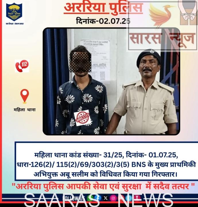 Post Views: 57 सारस न्यूज, अररिया। महिला थाना पुलिस ने दुष्कर्म के एक आरोपी को 24 घंटे के भीतर गिरफ्तार…