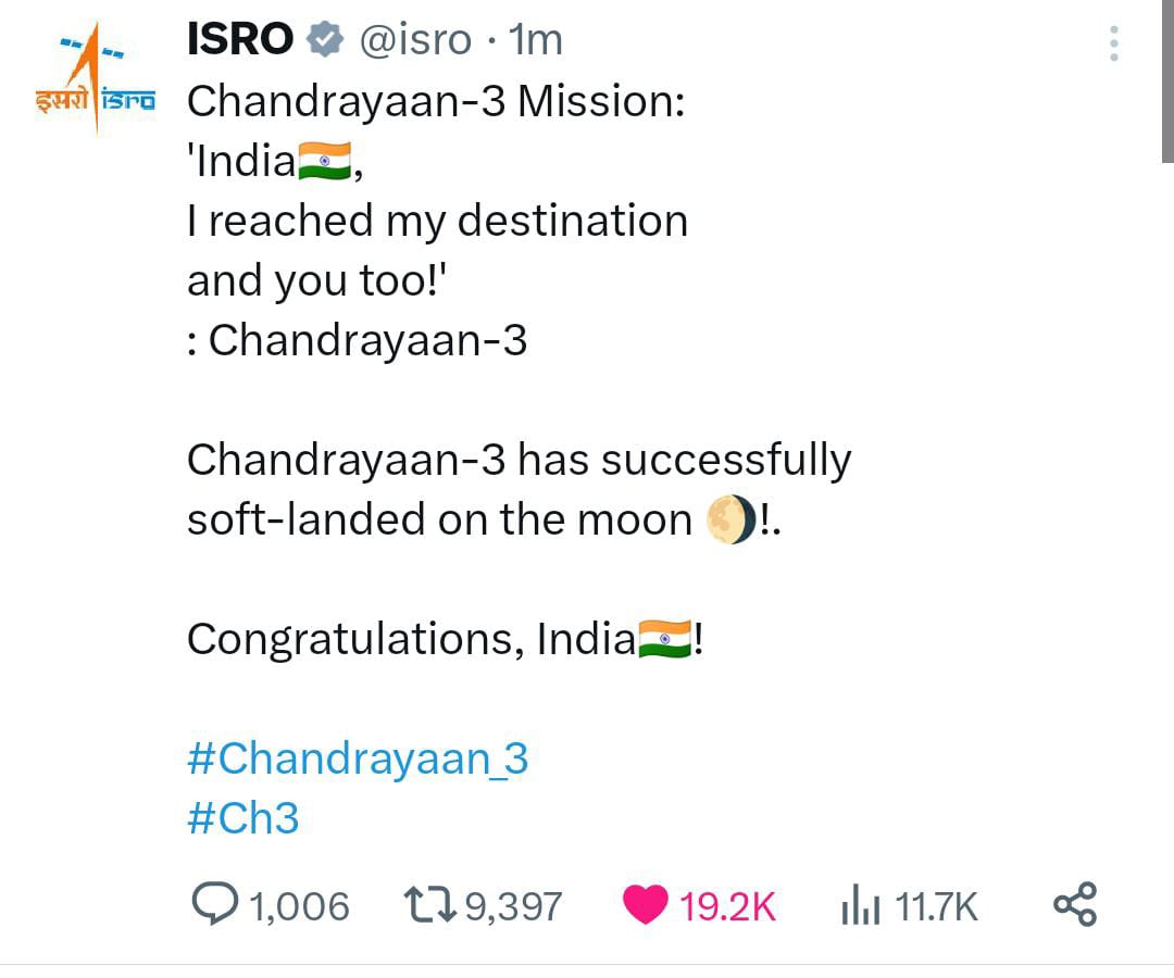 अंतरिक्ष में एकबार फिर भारत ने लंबी छलांग लगायी है और चंद्रयान -3 को चंद्रमा की सतह पर उतारने में कामयाब रहा है। भारतीय वैज्ञानिकों ने एकबार फिर अपनी प्रतिभा का लोहा मनवाते हुए चांद के दक्षिणी ध्रुव पर तिरंगा फहराया है। ऐसी उपलब्धि हासिल करने वाला भारत दुनिया का पहला देश बन गया है।