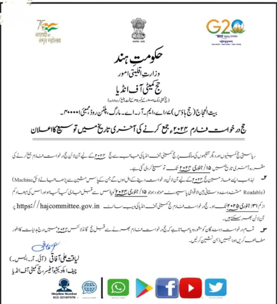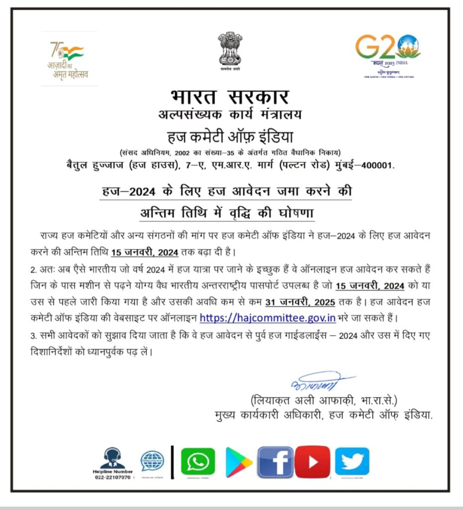 राज्य हज कमेटियों और अन्य संगठनों की मांग पर हज कमेटी ऑफ इंडिया द्वारा हज-2024 के लिए हज आवेदन करने की अन्तिम तिथि 15 जनवरी, 2024 तक बढ़ा दी गई है। अब ऐसे भारतीय जो साल 2024 में हज यात्रा पर जाने के इच्छुक हैं वे ऑनलाइन हज आवेदन कर सकते हैं। जिनके पास मशीन से पढ़ने योग्य वैध भारतीय अन्तरराष्ट्रीय पासपोर्ट उपलब्ध हैं जो 15 जनवरी, 2024 को या उस से पहले जारी किया गया है और उसकी अवधि कम से कम 31 जनवरी, 2025 तक है। हज आवेदन हज कमेटी ऑफ इंडिया की वेबसाइट पर ऑनलाइन https://hajcommittee.gov.in भरे जा सकते हैं।