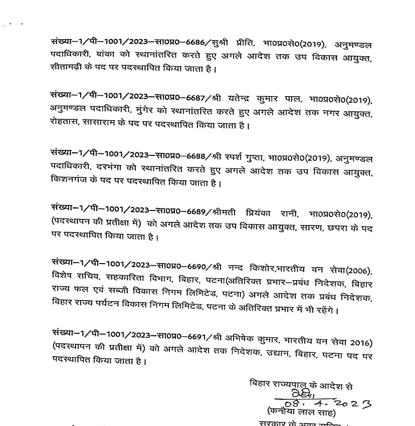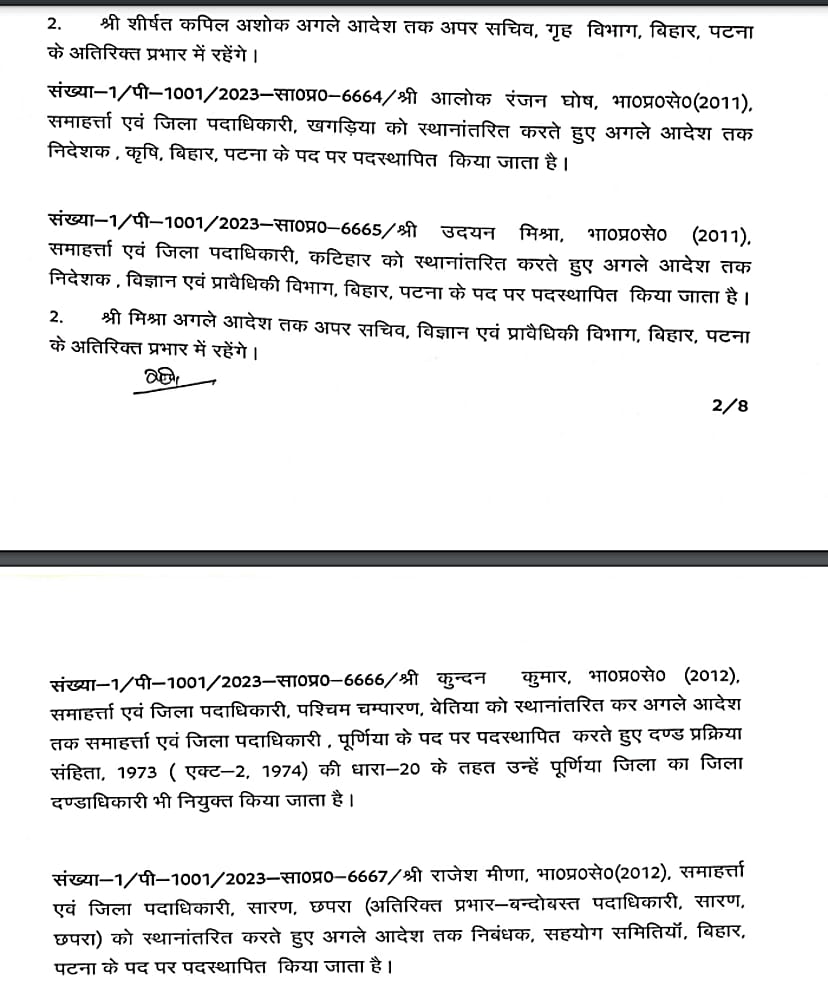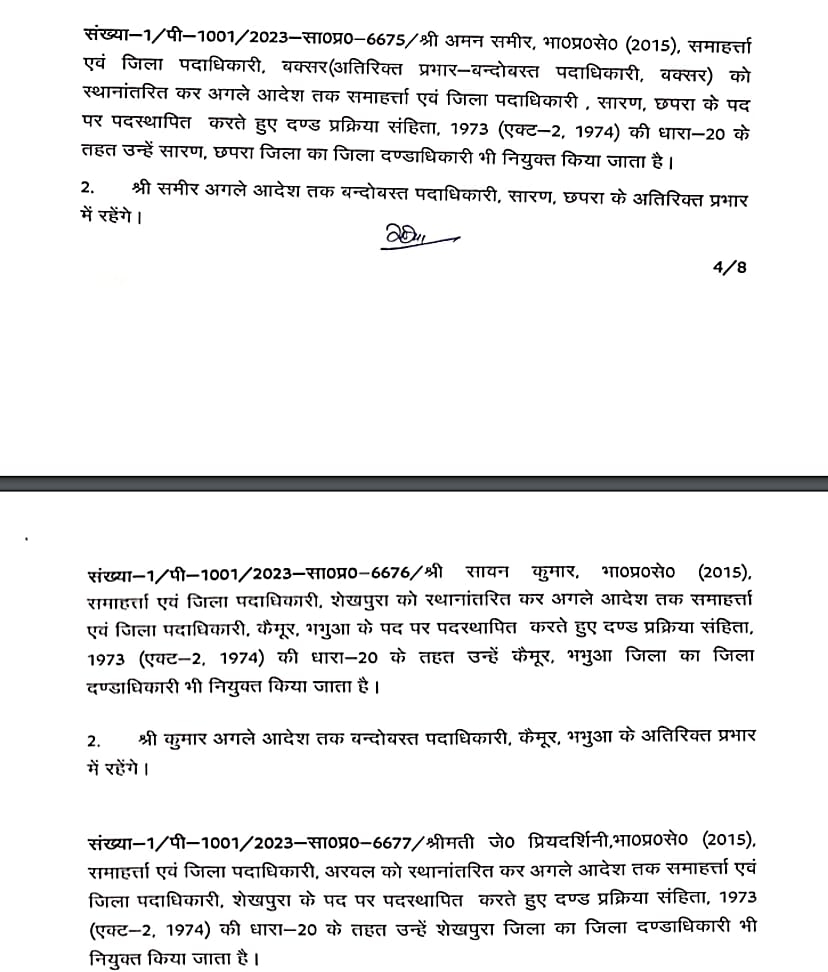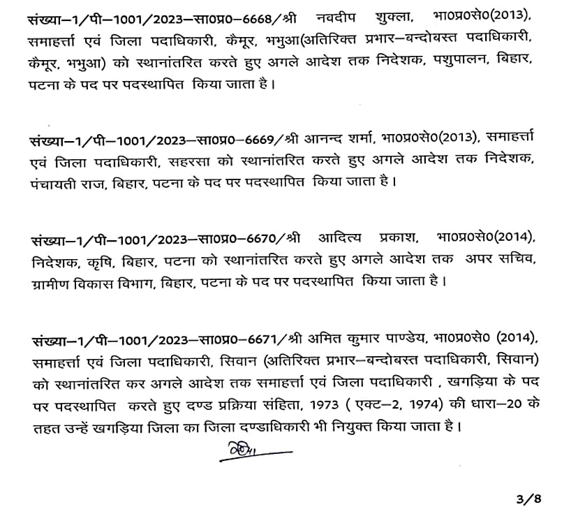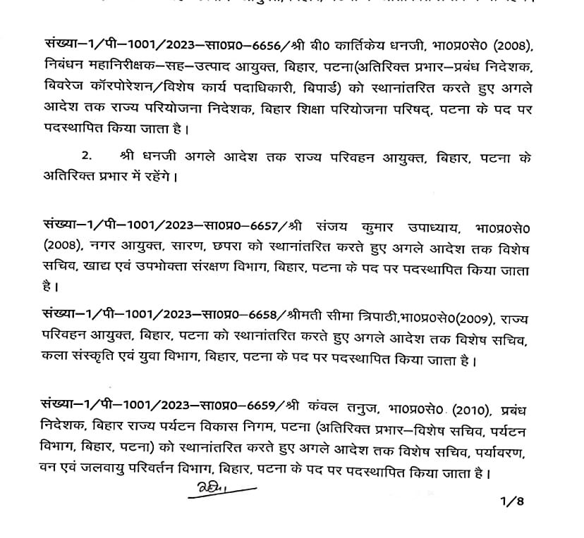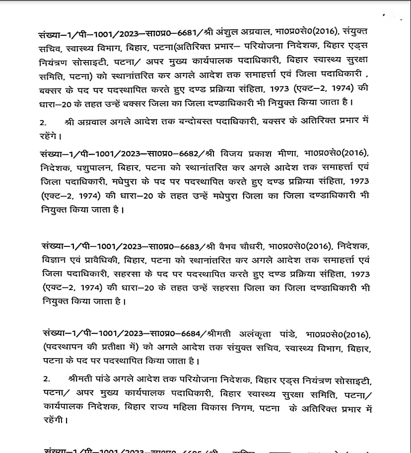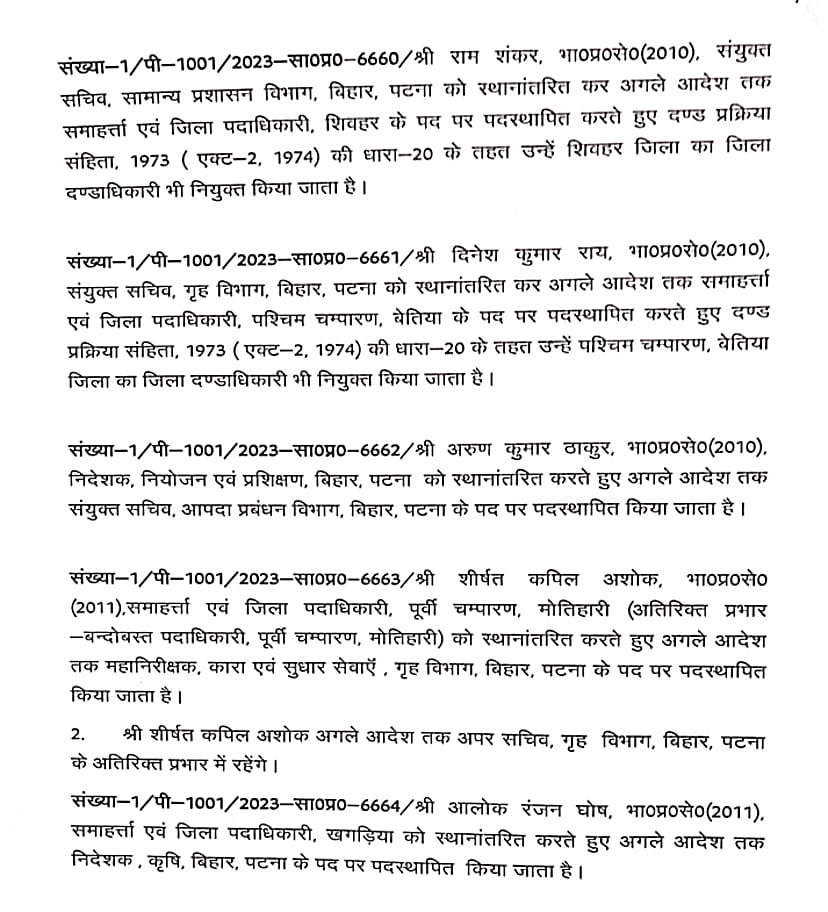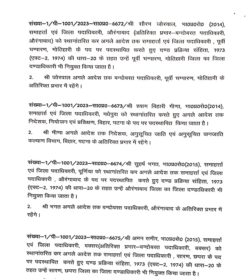 बिहार में बड़े पैमाने पर आईएएस अधिकारियों को स्थानांतरित किया गया है। कई जिलों के डीएम बदले गए हैं। इस संबंध में सामान्य प्रशासन विभाग ने अधिसूचना जारी कर दी है। लघु जल संसाधन विभाग के सचिव विनोद सिंह गुंजियाल को मद्ध निषेध विभाग का सचिव बनाया गया है। ये निबंधन महा निरीक्षक व उत्पाद आयुक्त के अतिरिक्त प्रभार में रहेंगे। बी. कार्तिकेय धनजी को राज्य परियोजना निदेशक बिहार शिक्षा परियोजना के पद पर पदस्थापित किया गया है। इसके साथ ही राज्य परिवहन आयुक्त के अतिरिक्त प्रभार में भी रहेंगे। सीमा त्रिपाठी को परिवहन आयुक्त से स्थानांतरित करते हुए विशेष सचिव कला संस्कृति एवं युवा विभाग के पद पर पदस्थापित किया गया है।