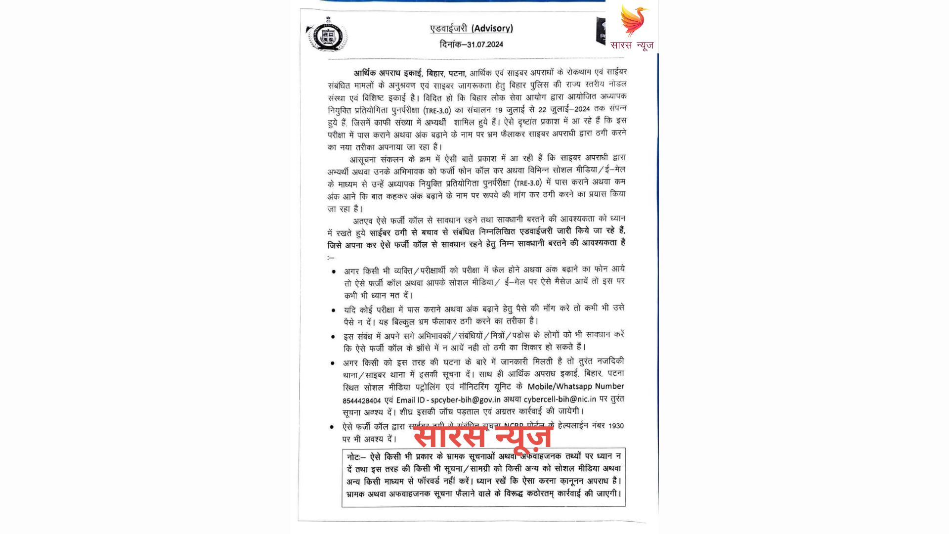 आर्थिक अपराध इकाई, बिहार द्वारा एडवाइजरी जारी किया गाया जिसमे कहा गया है, अध्यापक नियुक्ति प्रतियोगिता पुनर्परीक्षा (TRE-3.0) में पास कराने या अंक बढ़ाने के लिए आने वाले कॉल या मैसेज से रहें सावधान! ऐसे कॉल्स के झांसे में आकर पैसे न दें। इस प्रकार के कॉल्स या मैसेज की रिपोर्ट 8544428404 पर करें या ईमेल करें spcyber-bih@gov.in या cybercell-bih@nic.in पर।