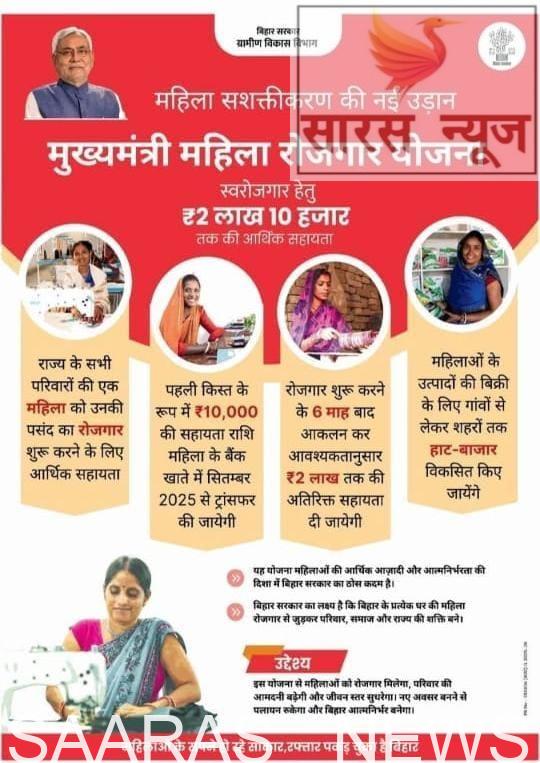 बिहार सरकार ने शुक्रवार को महिलाओं के लिए एक बड़ा कदम उठाते हुए ‘मुख्यमंत्री महिला रोजगार योजना’ को हरी झंडी दे दी। इस महत्वाकांक्षी योजना का उद्देश्य महिलाओं को आर्थिक सहायता प्रदान कर उन्हें आत्मनिर्भर बनाना है।