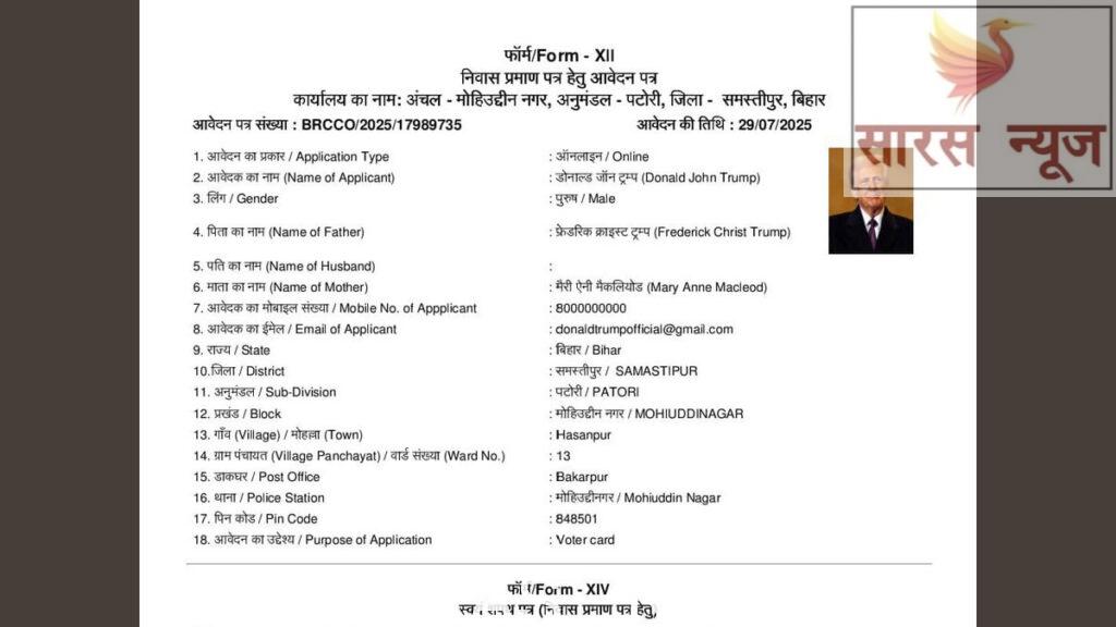 बिहार के समस्तीपुर जिले से एक हैरान कर देने वाला मामला सामने आया है, जहां अमेरिका के पूर्व राष्ट्रपति डोनाल्ड ट्रंप के नाम और फोटो के साथ एक निवास प्रमाण पत्र के लिए ऑनलाइन आवेदन किया गया। इससे पहले बिहार में कौआ, राम-सीता और यहां तक कि “डॉग बाबू” के नाम पर भी निवास प्रमाण पत्र बनाए जा चुके हैं।