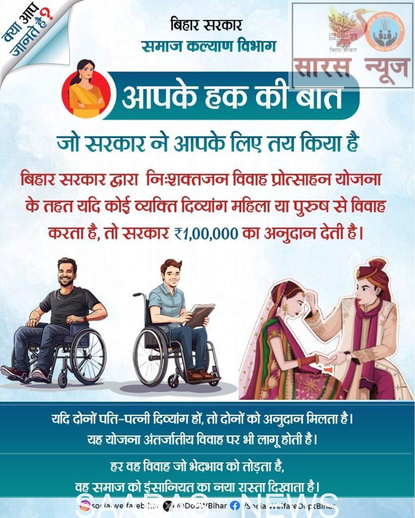 बिहार सरकार के समाज कल्याण विभाग द्वारा दिव्यांगजनो के कल्याण के लिए चलाई जा रही “निःशक्तजन विवाह प्रोत्साहन योजना” के तहत एक महत्वपूर्ण प्रावधान किया गया है। यदि कोई व्यक्ति किसी दिव्यांग महिला या पुरुष से विवाह करता है, तो सरकार उसे ₹1,00,000 की अनुदान राशि देती है।