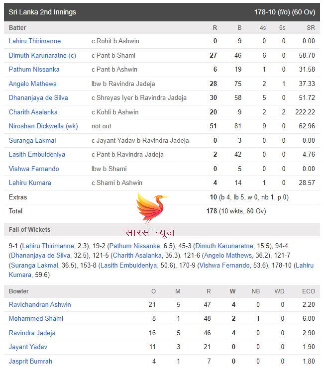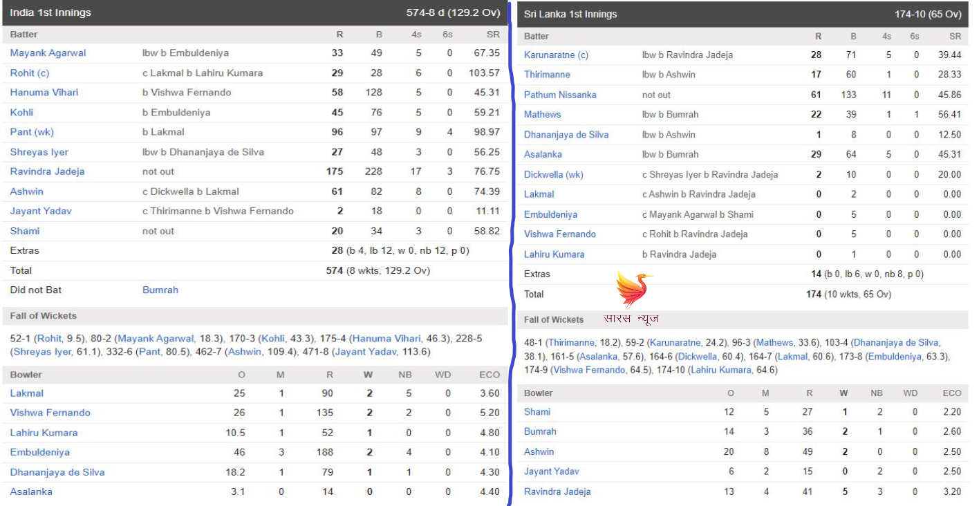 भारत और श्रीलंका के बीच पहले टेस्ट के दूसरे दिन का खेल ख़त्म। दूसरे दिन श्रीलंका की टीम 466 रनों से पीछे हैं, उनका स्कोर 4 विकेट के नुक़सान पर 108 रन हैं। इससे पहले भारत ने 8 विकेट के नुक़सान पर 574 रन बनाकर पारी घोषित की।