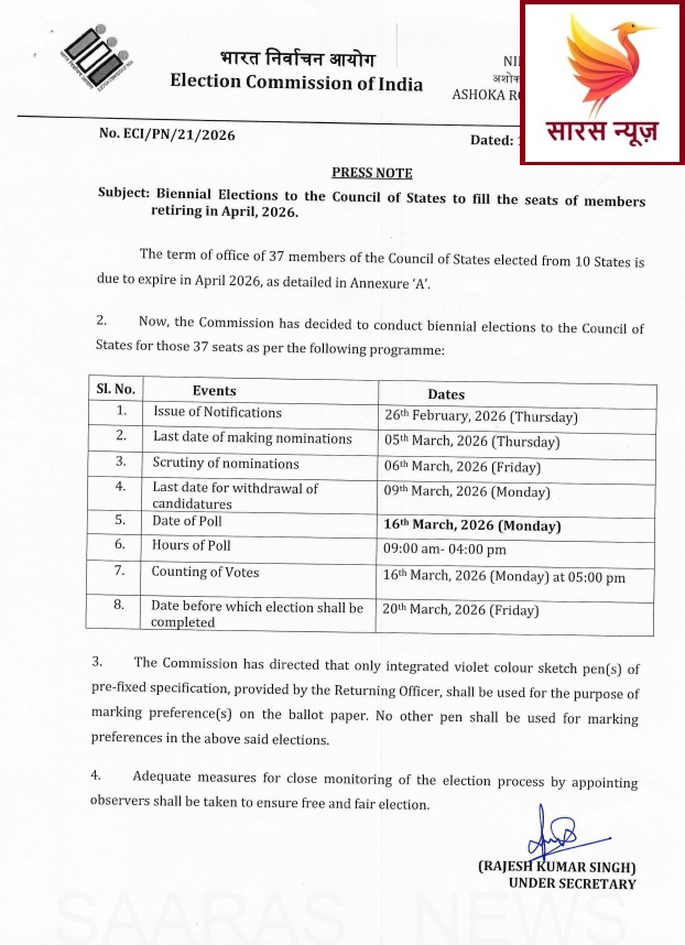 नई दिल्ली: Election Commission of India ने राज्यसभा की 37 सीटों के लिए द्विवार्षिक चुनाव की घोषणा कर दी है। ये चुनाव 10 राज्यों की उन सीटों के लिए होंगे, जिन पर वर्तमान सदस्यों का कार्यकाल अप्रैल 2026 में समाप्त हो रहा है।