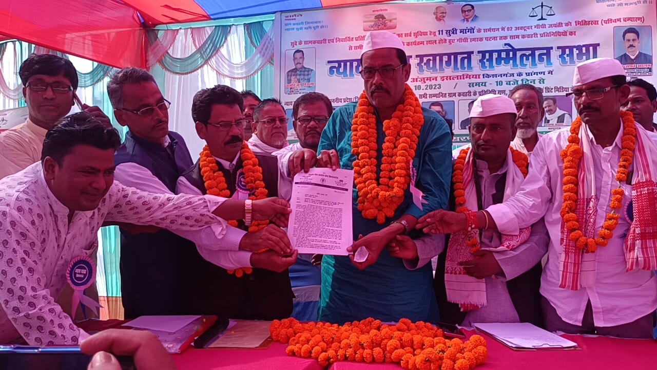 किशनगंज जिला मुख्यालय स्थित अंजुमन इस्लामिया के प्रांगण में जिला पंच-सरपंच संघ किशनगंज के तत्वाधान में जिला अध्यक्ष किशनगंज मोहम्मद जफर आलम के अध्यक्षता में न्याय यात्रा स्वागत सम्मेलन सभा का आयोजन किया गया। इस न्याय यात्रा स्वागत सम्मेलन सभा में मुख्य रूप से मौजूद बिहार प्रदेश पंच सरपंच संघ के प्रदेश अध्यक्ष अमोद कुमार निराला को फूलों की माला पहनाते हुए गुलदस्ता भेंट कर स्वागत किया।
