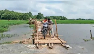 टेढ़ागाछ प्रखंड के चिल्हनियां पंचायत स्थित चचरी पुल से गुजरते हैं लोग, बना रहता है खतरा, चचरी पुल से उस पार जाना ग्रामीणों की मजबूरी।