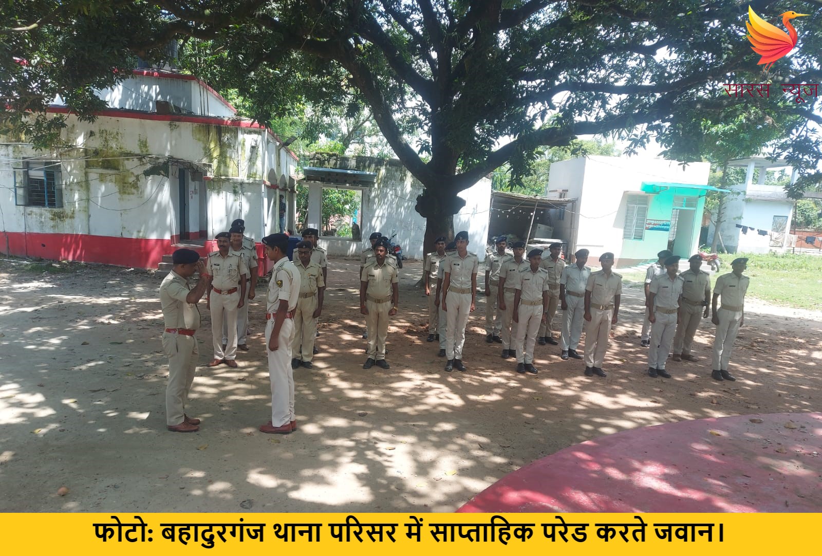 बहादुरगंज थाना परिसर में पुलिस अधीक्षक के निर्देश पर साप्ताहिक परेड का आयोजन किया गया। जहां परेड के दौरान पुलिस कर्मियों सहित सभी चौकीदारों को थानाध्यक्ष चितरंजन यादव ने बेहतर पुलिसिंग एवं क्षेत्र में विधि व्यवस्था संधारण हेतु कई निर्देश दिये।