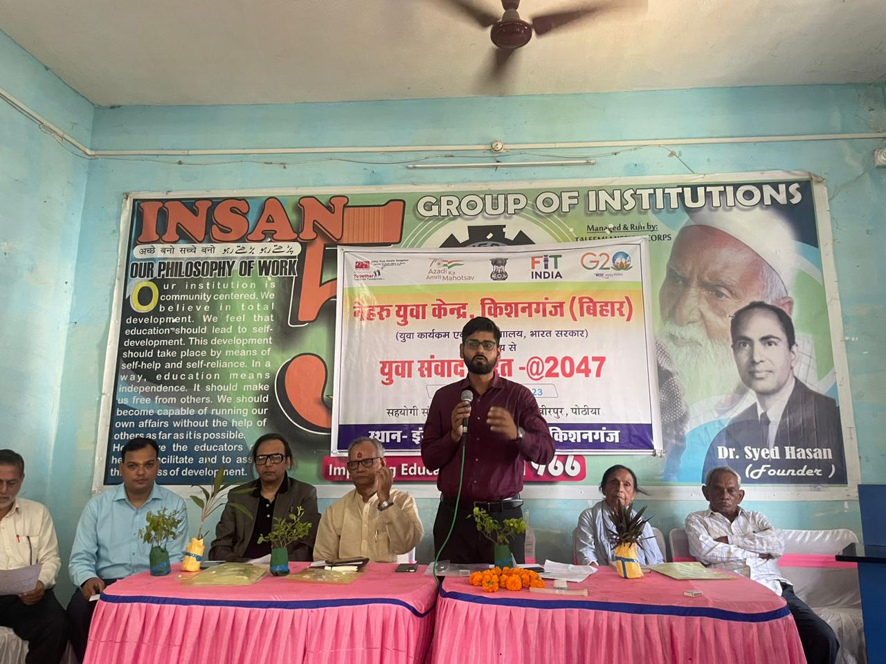 नेहरू युवा केंद्र किशनगंज के तत्वाधान में सहयोगी संस्था के माध्यम से युवा संवाद भारत 2047 कार्यक्रम का आयोजन किशनगंज शहर के सुभाष पल्ली स्थित इंसान डिग्री कॉलेज किशनगंज के सभागार में आयोजित किया गया। इस कार्यक्रम के मुख्य अतिथि के रूप में मोहम्मद रजा सैयद हाफिज निर्देशक इंसान डिग्री कॉलेज किशनगंज, विशिष्ट अतिथि के रूप में श्यामानंद झा, इंसान स्कूल के प्रिंसिपल, जिला युवा अधिकारी नेहरू युवा केंद्र किशनगंज ने भाग लेकर दीप प्रज्वलित कर कार्यक्रम का शुभारंभ किया।