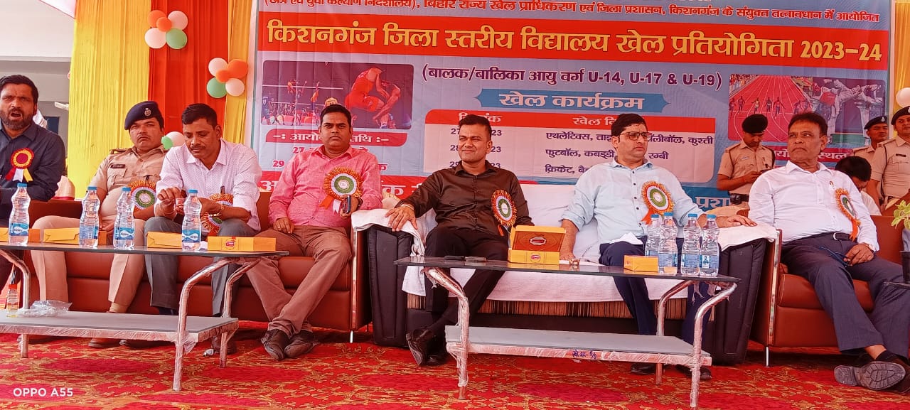 कला, संस्कृति एवं युवा विभाग, बिहार सरकार एवं बिहार राज्य खेल प्राधिकरण तथा जिला प्रशासन किशनगंज के संयुक्त तत्वावधान में वार्षिक खेल कार्यक्रम 2023 अंतर्गत किशनगंज जिला स्तरीय विद्यालय खेल प्रतियोगिता का शुभारंभ शुक्रवार को शहीद अशफ़ाक़ उल्लाह खां स्टेडियम, खगड़ा, किशनगंज में किया गया ।वार्षिक खेल प्रतियोगिता का शुभारंभ किशनगंज जिला पदाधिकारी तुषार सिंगला और पुलिस अधीक्षक डॉ इनाम उल हक़ के द्वारा खगड़ा स्टेडियम में आयोजित समारोह में संयुक्त रूप से दीप प्रज्वलित कर किया गया। 27 से 29 अक्टूबर तक तीन दिवसीय जिलास्तरीय खेल प्रतियोगिता में अंडर-14, 17, एवं 19 आयु वर्ग के अलग-अलग बालक और बालिकाओं ने अपने अपने खेल विधा में भाग लिया। प्रथम दिन खेल प्रतियोगिता में विभिन्न खेल विशेषकर एथलेटिक्स और ताईक्वांडो में बच्चों का जुनून आकर्षित कर रहा था। सरस्वती विद्या मंदिर के बच्चों ने बैंड धुन के साथ मार्च पास्ट की अगुवाई की। सभी प्रखंडों की सहभागिता रही। इस वर्ष 1200 से अधिक प्रतिभागियों से निबंधन करवाया है।