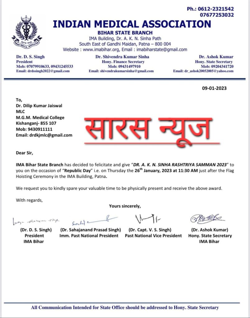 पूर्णिया प्रमंडल से भाजपा विधान पार्षद एंव माता गुजरी मेमोरियल मेडिकल कॉलेज सह लाइंस सेवा केन्द्र किशनगंज के डायरेक्टर डॉ. दिलीप कुमार जायसवाल को समाज एंव चिकित्सा सेवा के क्षेत्र में उत्कृष्ट कार्य करने पर इण्डियन मेडिकल एसोसिएशन के द्वारा सम्मानित किया जायेगा। “डाक्टर ए के एन सिन्हा राष्ट्रीय सम्मान 2023” एवार्ड के लिए दिलीप कु. जायसवाल के नाम का चयन इनकी सेवाओं को देखते हुए किया गया है। जिससे किशनगंज मेडिकल कॉलेज एंव डॉ. दिलीप कुमार जायसवाल के समर्थकों में भारी उत्साह का माहौल है। आईएमए के द्वारा गणतंत्र दिवस के अवसर पर डॉ. दिलीप कुमार जायसवाल को सम्मानित किया जायेगा।