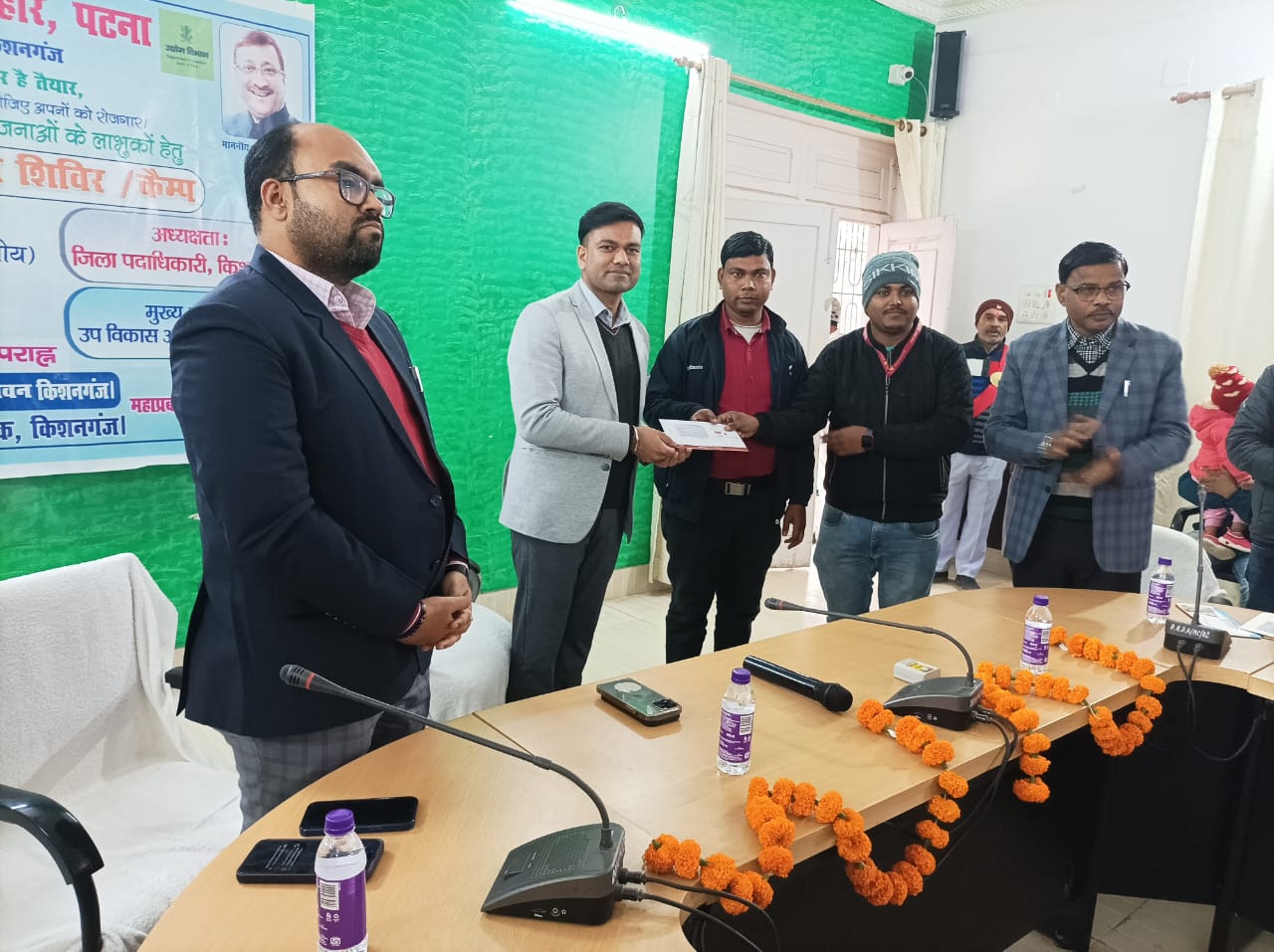जिला पदाधिकारी तुषार सिंगला की अध्यक्षता में रचना भवन डीआरडीए किशनगंज में प्रधानमंत्री रोजगार सृजन कार्यक्रम एवं प्रधानमंत्री सुक्ष्म खाद्य उद्यम उन्नयन योजना के अन्तर्गत लाभुकों के बीच ऋण वितरण हेतु ऋण वितरण शिविर का आयोजन किया गया। कार्यक्रम में डीएम का स्वागत जीएम जिला उद्योग केंद्र के द्वारा पुष्पगुच्छ देकर किया गया। तत्पश्चात जिला पदाधिकारी के द्वारा सभी लाभुकों से दीप प्रज्ज्वलित करा कर कार्यक्रम का शुभारंभ किया गया। इस कार्यक्रम में जिला पदाधिकारी के द्वारा 15 पीएमईजीपी के लाभुकों को लगभग 1 करोड़ रूपये का ऋण वितरण किया गया एवं 3 पीएमएफएमइ के लाभुकों को 20 लाख का ऋण वितरण किया गया। इस अवसर पर जिला पदाधिकारी के द्वारा सभी लाभुकों को हार्दिक शुभकामनाएँ दी एवं सभी बैंक एवं सभी बैंक के पदाधिकारी से दोनो योजना का शत प्रतिशत लक्ष्य प्राप्त करने का निदेश दिया गया। डीएम ने बैंकों के सहयोग के लिए उनकी प्रशंसा भी की । मौके पर उप विकास आयुक्त स्पर्श गुप्ता, महाप्रबंधक जिला उद्योग केन्द्र एवं सहायक उद्योग निदेशक उपस्थित थे। कार्यक्रम का संचालन अनिल कुमार रत्न उद्योग विस्तार पदाधिकारी के द्वारा किया गया।
