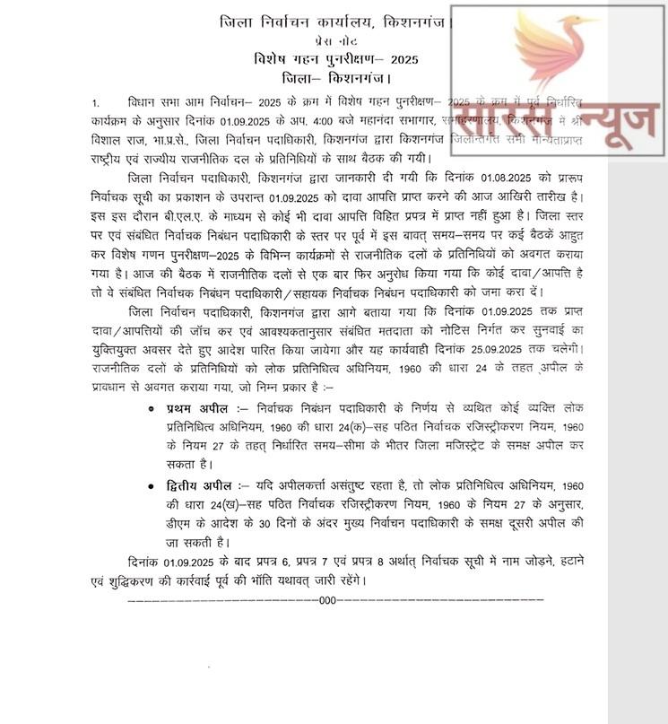 पिछले दिनों जिला एवं निर्वाचक निबंधन पदाधिकारी स्तर पर बार-बार विभिन्न बैठकों और कार्यक्रमों के जरिए सभी मान्यता प्राप्त राष्ट्रीय एवं राज्यीय राजनीतिक दलों के प्रतिनिधियों को विशेष पुनरीक्षण-2025 के चरणों के संबंध में सूचित किया गया। आज बैठक में भी एक बार पुनः सभी दलों से आग्रह किया गया कि यदि कोई दावा या आपत्ति हो तो उसे निर्धारित प्रपत्र में संबंधित पदाधिकारी को शीघ्र जमा करा दें।