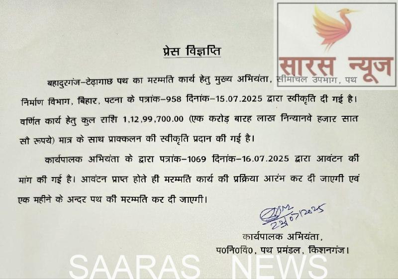 बहादुरगंज टेढ़ागाछ पथ का मरम्मति कार्य हेतु मुख्य अभियंता, सीमांचल उपभाग, पथ निर्माण विभाग, बिहार, पटना के पत्रांक-958 दिनांक-15.07.2025 द्वारा स्वीकृति दी गई है। वर्णित कार्य हेतु कुल राशि 1,12.99.700.00 (एक करोड़ बारह लाख निन्यानवे हजार सात सौ रूपये) मात्र के साथ प्राक्कलन की स्वीकृति प्रदान की गई है।