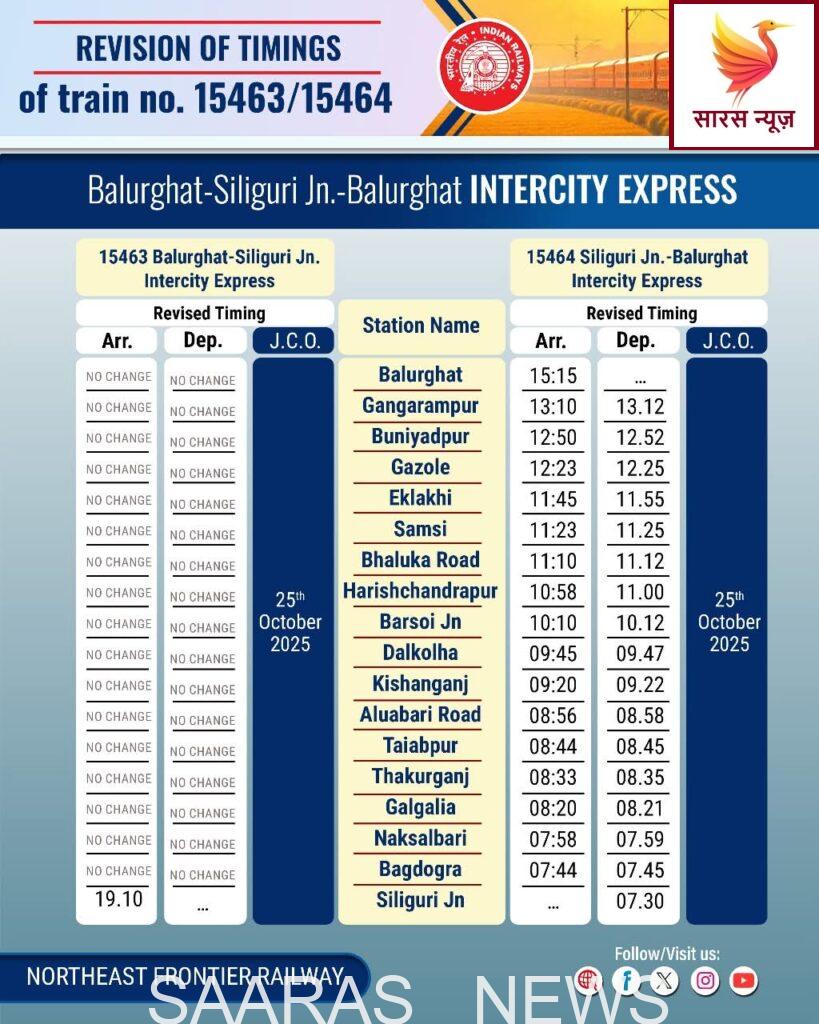 नॉर्थ ईस्ट फ्रंटियर रेलवे ने ट्रेन संख्या 15463/15464 बालुरघाट-सिलीगुड़ी जंक्शन इंटरसिटी एक्सप्रेस के प्रस्थान और आगमन समय में आंशिक परिवर्तन किया है। नया टाइम टेबल 25 अक्टूबर 2025 से प्रभावी होगा। रेलवे के अनुसार, ट्रेन संख्या 15464 (सिलीगुड़ी जंक्शन से बालुरघाट) अब सिलीगुड़ी से सुबह 07:30 बजे रवाना होगी और रास्ते के प्रमुख स्टेशनों पर संशोधित समय से पहुंचेगी। यह ट्रेन बागडोगरा, नक्सलबाड़ी, गलगलिया, ठाकुरगंज, किशनगंज, डालकोहा, बारसोई, हरिश्चंद्रपुर, भालुका रोड, एकलखी, गज़ोले, बुनीयादपुर और गंगारामपुर होते हुए बालुरघाट पहुंचेगी।