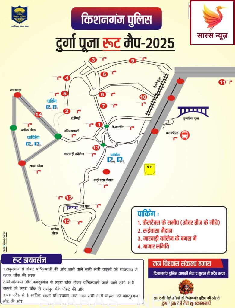 किशनगंज:आगामी दुर्गा पूजा को लेकर जिला पुलिस प्रशासन पूरी तरह से तैयार है। श्रद्धालुओं की भीड़ और यातायात व्यवस्था को नियंत्रित करने के लिए किशनगंज पुलिस ने ‘दुर्गा पूजा रूट मैप 2025’ जारी किया है।