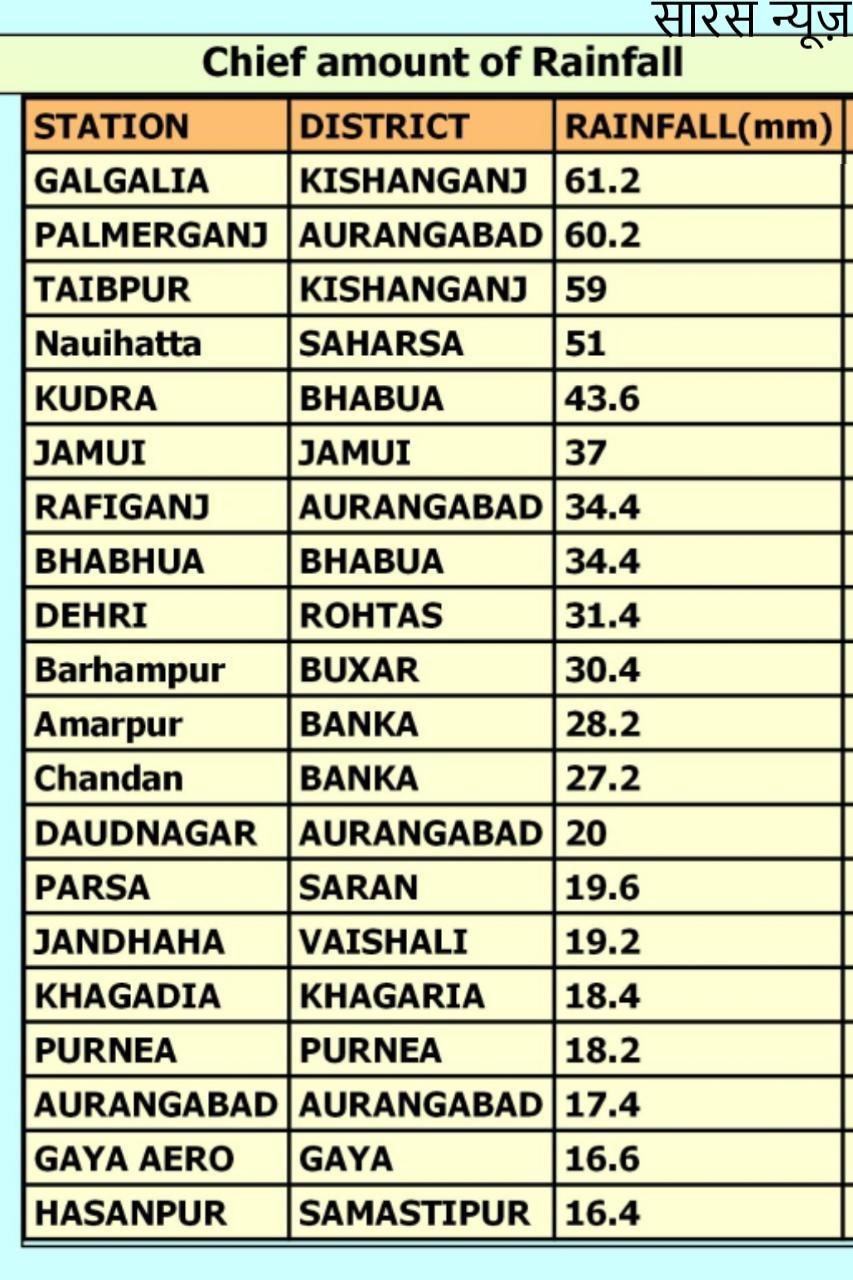 बिहार में पिछले 24 घंटे में किशनगंज के गलगलिया में सबसे ज्यादा 61.2 मिमी बारिश हुई। वही जिले के तैयबरपुर में 59 मिमी बारिश रिकॉर्ड किया गया। वहीं दूसरी ओर पूर्णिया में 18.2 मिमी बारिश हुई।