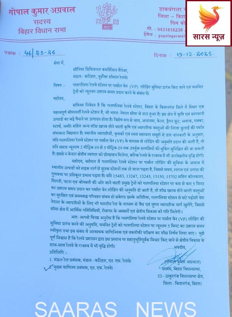 19 दिसंबर 2025 को विधायक गोपाल अग्रवाल ने कटिहार मंडल के सीनियर डिविजनल कमर्शियल मैनेजर को पत्र लिखकर गलगलिया स्टेशन पर पार्सल वैन लोडिंग की अनुमति देने और चयनित ट्रेनों को न्यूनतम 5 मिनट का ठहराव समय देने की मांग की। उन्होंने बताया कि यह स्टेशन भारत-नेपाल सीमा से सटा हुआ है और यहां धान, चावल, केला, अदरक, मक्का, स्टार्च, अरबी जैसे कृषि एवं वाणिज्यिक उत्पादों का बड़े पैमाने पर उत्पादन होता है।