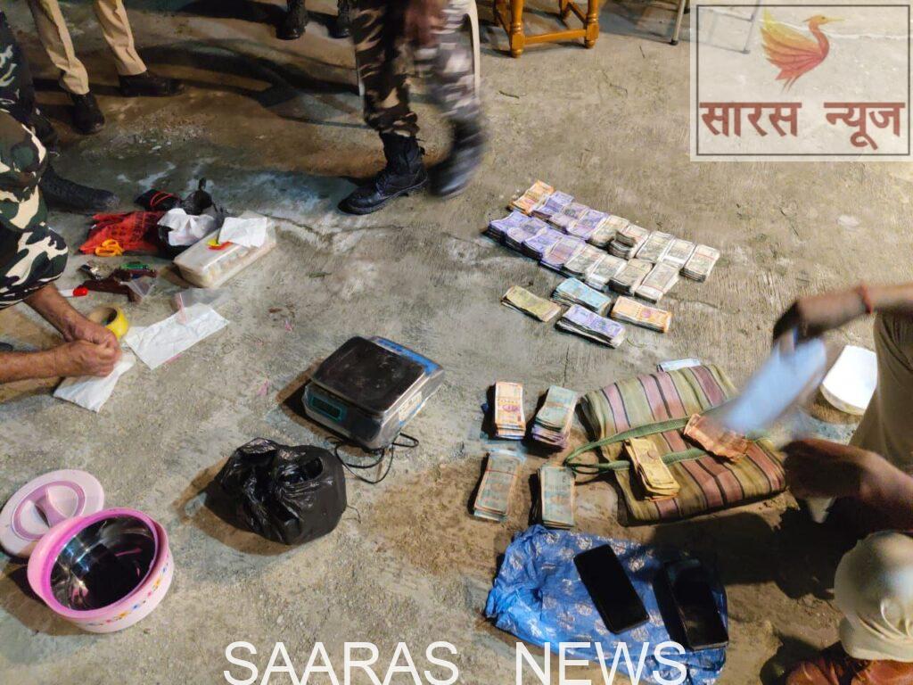 जिसके बाद गुरुवार की दोपहर 1 बजे गलगलिया थानाध्यक्ष और 41 बटालियन भातगांव बीओपी के जवानों के द्वारा संयुक्त कारवाई करते हुए एक कारोबारी के घर को चारों तरफ से घेराबंदी कर घर में मौजूद घर के मालिक को छापेमारी से सम्बंधित एक नोटिस तामिल करा कर घर की विधिवत तलाशी ली गई। घर के तलाशी के दौरान घर के अंदर वहीं तलाशी के दौरान अभियुक्त के घर से संदिग्ध ब्राऊन शुगर के जैसा चिपचिपा पॉलीथिन में लपेटा हुआ मादक पदार्थ बरामद किया गया। जिसका कुल वजन 144 ग्राम ब्राउन शुगर पाया गया साथ उसके घर से भारी मात्रा में नकदी 6 लाख 12 हजार रुपए बरामद की गई वहीं मौके से नशे का कारोबारी मो शमशाद पिता महबूब साकिन दरभंगिया टोला थाना- गलगलिया, जिला- किशनगंज को गिरफ्तार कर बरामद जब्त समान के साथ थाना लाया गया। वही एक तस्कर रोजी बेगम मौके से फरार हो गई चूंकि अवैध रूप से मादक पदार्थ रखना एवं उसकी खरीद-बिक्री करना एक संघेय अपराध है जिसको लेकर थानाध्यक्ष राकेश कुमार के द्वारा गलगलिया थाना में एनडीपीएस एक्ट के तहत कार्रवाई करते हुए उक्त अभियुक्त को न्यायिक हिरासत में शुक्रवार को जेल भेजा जाएगा वहीं मौके पर अंचला अधिकारी मृत्युंजय कुमार एसएसबी के आला अधिकारी मौजूद रहे।