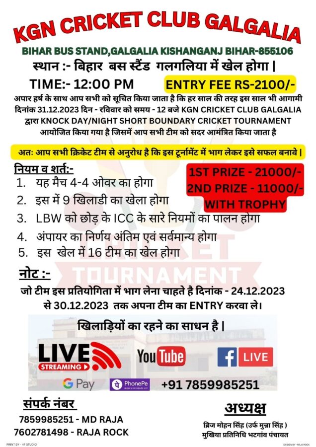 गलगलिया के बसस्टैंड परिसर में 31 दिसंबर 2023 को नाईट शॉट बाउंड्री क्रिकेट टूर्नामेंट का आयोजन किया जा रहा है। यह आयोजन केजीएन क्रिकेट क्लब गलगलिया के द्वारा भातगाँव पंचायत के मुखिया प्रतिनिधि बृजमोहन सिंह की अध्यक्षता में की जा रही है। मुखिया प्रतिनिधि बृजमोहन सिंह व आयोजन कमिटी के सदस्यों ने मंगलवार को स्थानिय पत्रकारों को उक्त आयोजन की जानकारी देते हुए बताया कि आगामी दिनांक 31.12.2023 दिन रविवार को समय 12 बजे टूर्नामेंट का आगाज होगा। वहीं 4-4 ओवर के खेल में 09 खिलाड़ी का खेल होगा और टूर्नामेंट में कुल 16 टीम भाग लेंगे। बताया कि टूर्नामेंट में भाग लेने वाले टीम को प्रवेश शुल्क के रूप में 2100/- रुपये का भुगतान करना होगा। वहीं टूर्नामेंट में विजेता टीम के लिए 21000/- एवं उपविजेता टीम के लिए 11000/- रुपया नकद इनाम रखे गए हैं। इन्होंने इच्छुक टीम को जल्द से जल्द रजिस्ट्रेशन कराने की अपील की है।