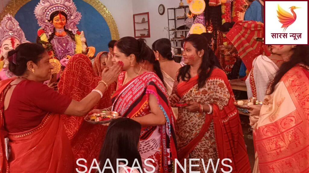 इस अवसर पर बंगाली समुदाय की महिलाओं ने परंपरा अनुसार मां दुर्गा का खोइचा भरकर उन्हें सिंदूर अर्पित किया। इसके बाद महिलाओं ने एक-दूसरे को भी सिंदूर लगाकर माता को नमन किया और नम आंखों से विदाई दी। यह दृश्य अत्यंत भावुक था, जहाँ आंखों में आंसू और चेहरों पर मुस्कान दोनों दिखाई दे रहे थे।