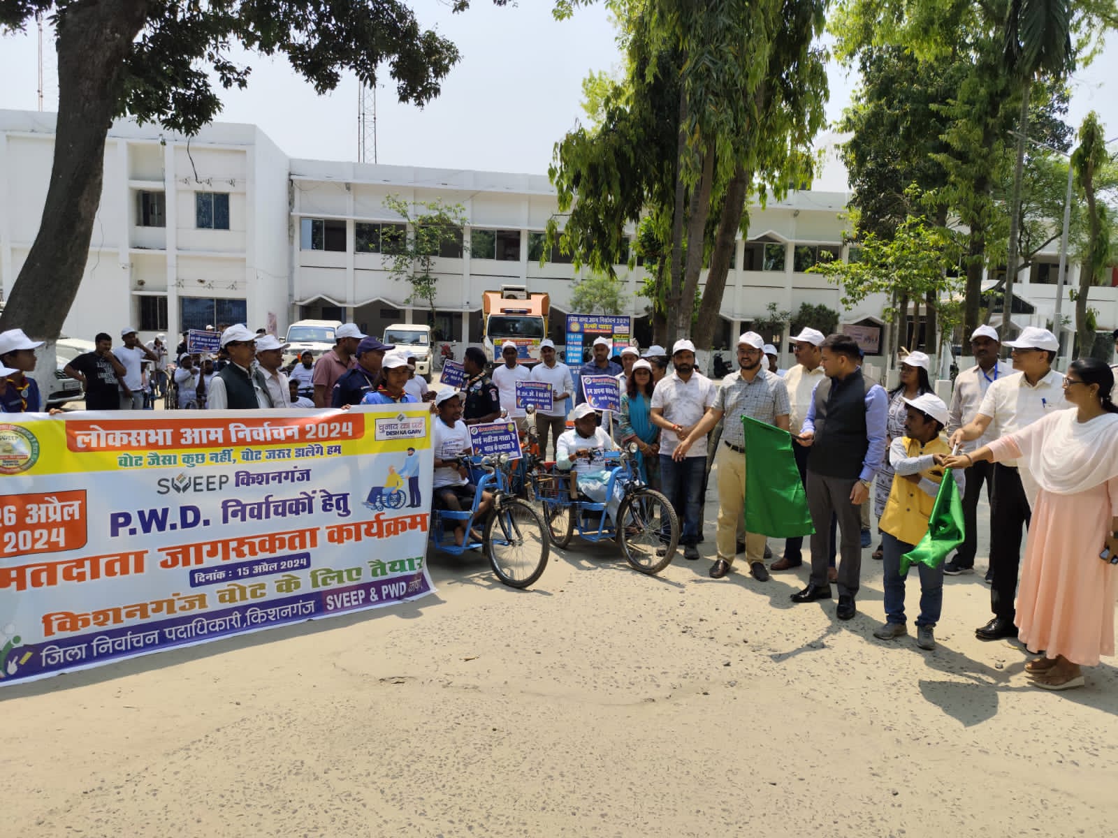 जिला पदाधिकारी तुषार सिंगला द्वारा दिव्यांग मतदाताओं को जागरूक करने हेतु साइकिल रैली को हरी झंडी दिखाकर समाहरणालय परिसर से रवाना किया गया। यह रैली डे मार्केट से गांधी चौक होते हुए मनोरंजन क्लब पहुंची। रैली में लगभग 25 दिव्यांगजन अपने बैट्री चालित ट्राईसाईकिल पर सवार होकर चल रहे थे। उनके साथ साथ 20 स्काउट गाइड का जस्ता तथा बुनियाद संजीवनी वाहन को भी शामिल किया गया था। रैली में राज्य पीडब्ल्यूडी स्वीप आइकॉन अभ्युदय शरण भी शामिल हुए।