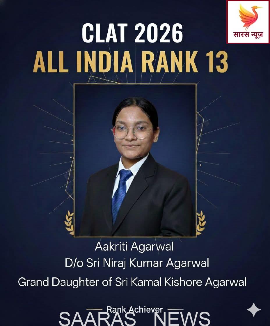 किशनगंज जिला के लिए यह अत्यंत गर्व और हर्ष का क्षण है। जिले के जाने-माने उद्योगपति कमल किशोर अग्रवाल की पौत्री एवं नीरज अग्रवाल की सुपुत्री आकृति अग्रवाल ने विधि क्षेत्र की देश की सबसे प्रतिष्ठित प्रवेश परीक्षाओं में से एक कॉमन लॉ एडमिशन टेस्ट (CLAT) में शानदार प्रदर्शन करते हुए पूरे भारत में 13वां स्थान (ऑल इंडिया रैंक–13) प्राप्त किया है। उनकी इस उपलब्धि से न केवल परिवार बल्कि पूरे किशनगंज जिले का नाम राष्ट्रीय स्तर पर गौरवान्वित हुआ है।आकृति की यह सफलता उनकी कड़ी मेहनत, अनुशासन, लगन और निरंतर प्रयास का परिणाम है। कम उम्र में इस तरह की बड़ी उपलब्धि हासिल कर उन्होंने यह सिद्ध कर दिया है कि सही मार्गदर्शन, आत्मविश्वास और लक्ष्य के प्रति समर्पण से किसी भी मुकाम को हासिल किया जा सकता है। उनकी इस उपलब्धि से जिले के युवाओं और विद्यार्थियों को भी प्रेरणा मिलेगी कि वे उच्च लक्ष्य निर्धारित कर पूरे मनोयोग से अध्ययन करें।आकृति अग्रवाल की सफलता की खबर मिलते ही जिले में खुशी की लहर दौड़ गई है। शुभचिंतकों, शिक्षकों, सामाजिक कार्यकर्ताओं एवं गणमान्य लोगों ने उन्हें बधाई देते हुए उनके उज्ज्वल भविष्य की कामना की है। सभी को विश्वास है कि आकृति आगे चलकर विधि के क्षेत्र में नई ऊंचाइयों को छुएंगी और समाज व देश के लिए एक मिसाल बनेंगी।इस संबंध में स्थानीय नागरिक के पी आर्या ने कहा कि किशनगंज जिले को ऐसी प्रतिभाशाली बेटी पर गर्व है, जिसने अपनी मेहनत और प्रतिभा से जिले का मान बढ़ाया है।