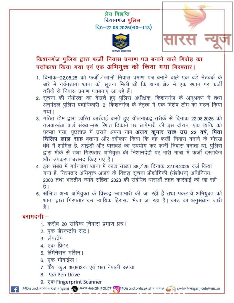 मिली जानकारी के अनुसार, 22 अगस्त को गर्वनडांगा थाना क्षेत्र से पुलिस को सूचना मिली थी कि इलाके में अवैध तरीके से निवास प्रमाण पत्र तैयार किए जा रहे हैं। इस पर पुलिस अधीक्षक सागर कुमार के निर्देश पर अनुमंडल पुलिस पदाधिकारी-2 ठाकुरगंज मंगलेश कुमार सिंह के नेतृत्व में विशेष टीम बनाई गई और योजनाबद्ध तरीके से छापेमारी की गई।