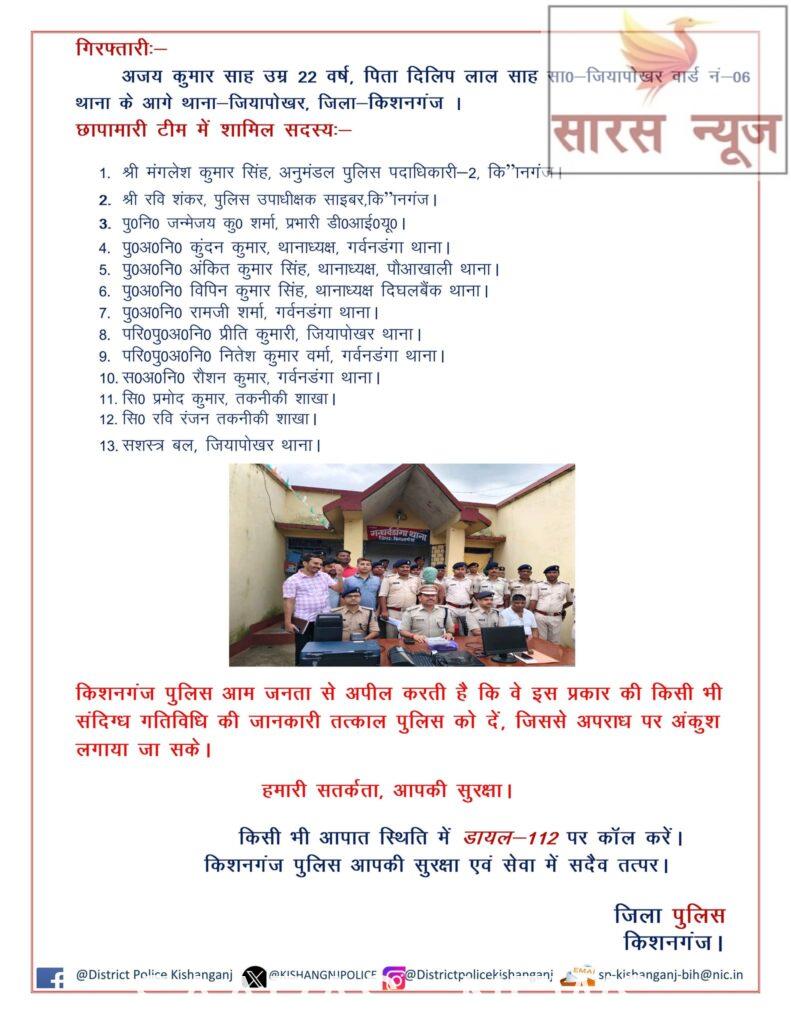 इस पूरी कार्रवाई में एसडीपीओ ठाकुरगंज-2 मंगलेश कुमार, साइबर सेल डीएसपी रवि रंजन, जियापोखर थाना प्रभारी जितेंद्र कुमार, गर्वनडांगा थानाध्यक्ष संजय कुमार, दिघलबैंक थानाध्यक्ष बिपिन कुमार सहित कई अधिकारी व तकनीकी टीम के जवान शामिल रहे।