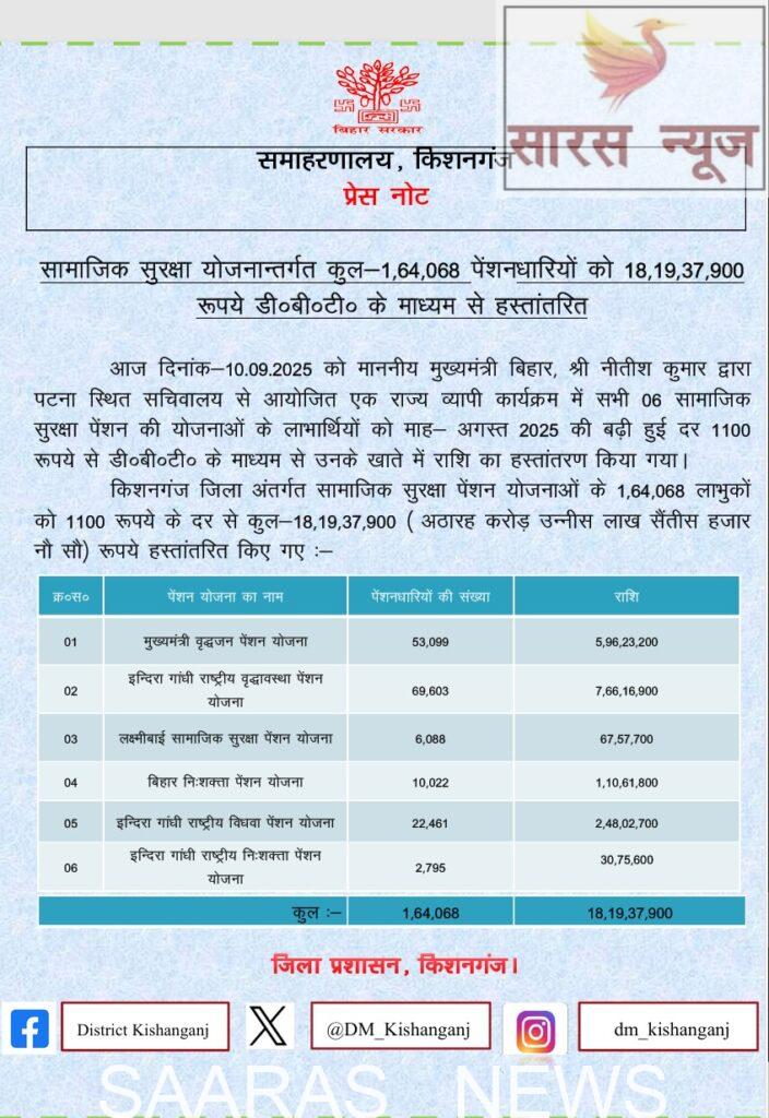 जिला प्रशासन, किशनगंज ने कहा कि राज्य सरकार की यह पहल सामाजिक सुरक्षा को मजबूत करने की दिशा में एक अहम कदम है और इसका लाभ समाज के सबसे कमजोर वर्ग तक पहुँच रहा है।