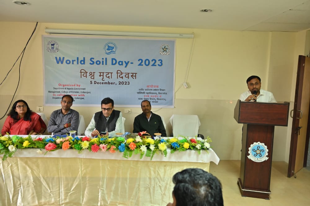 विश्व मृदा दिवस के अवसर पर मात्स्यिकी महाविद्यालय अर्राबाड़ी में एक दिवसीय किसान गोष्ठी का आयोजन किया गया। इस कार्यक्रम में आयोजन के संयोजक एवं महाविद्यालय के अधिष्ठाता डॉ वी पी सैनी समेत महाविद्यालय के अन्य विभागों के सहायक प्राध्यापक, कार्यक्रम के मुख्य अतिथि के रूप में जिला मत्स्य कार्यालय से मत्स्य विकास पदाधिकारी मनोज कुमार एवं जिले के दर्जनों प्रगतिशील किसानों ने बढ़-चढ़ कर भाग लिया। कार्यक्रम का शुभारंभ महाविद्यालय के प्रांगण में पौधरोपण के साथ किया गया। पौधरोपण होने के बाद डॉ वी पी सैनी ने किसानों को संबोधित करते हुए वर्तमान परिदृश्य में मृदा के सरंक्षण पर बल दिया एवं खेती में अप्रासंगिक रूप से उपयोग में लाए जाने वाले रासायनिक उर्वरकों एवं दवाओं के दुष्परिणामों से अवगत कराया। उन्होंने भविष्य में इससे होने वाले दुष्प्रभावों को लेकर अपनी चिंताएं जाहिर कीं। कार्यक्रम के दूसरे सत्र में किसानों के साथ गोष्ठी एवं संवाद का आयोजन किया गया जिसमें महाविद्यालय के विभिन्न विभागों के सहायक प्राध्यापकों समेत महाविद्यालय के डीन स्वयं मौजूद रहे। इस संवाद के दौरान जिले के प्रगतिशील किसानों द्वारा मछली पालन से संबंधित समस्याओं को सुना गया एवं मछली पालन से अत्यधिक मुनाफा कमाने के गुर बताए गए। डॉ वी पी सैनी ने अपने उद्बोधन में मत्स्यपालकों से भारत की अपनी प्रजातियों के मछली पालन पर विशिष्ट बल दिया एवं विदेशी मछलियों के नुकसानों के बारे में जानकारी दी। उन्होंने मछली पालन, उत्पादन, संवर्धन एवं विपणन से जुड़ी बहुत सारी जानकारियां साझा की जिसके पश्चात् किसान आत्मविश्वास से लबरेज दिखे। कार्यक्रम के सफल संचालन में कार्यक्रम के आयोजक एवं जलीय पर्यावरण विभाग के अध्यक्ष तापस पॉल, कार्यक्रम के समन्वयक व जलीय पर्यावरण विभाग के सहायक प्राध्यापक क्रमशः आशुतोष कुमार व मधु कुमारी एवं जलीय जंतु स्वास्थ्य विभाग की सहायक प्राध्यापिका पुष्पा कुमारी एवं अन्य अधिकारियों की भूमिका महत्वपूर्ण रही।