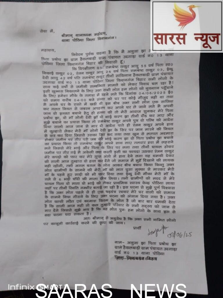 पोठिया (किशनगंज)। थाना क्षेत्र के हैकलबाड़ी ग्राम पंचायत अंतर्गत वार्ड संख्या 13 की रहने वाली अनुजा कुमारी ने पोठिया थाने में जान से मारने के प्रयास को लेकर गंभीर आरोप लगाते हुए लिखित शिकायत दी है।