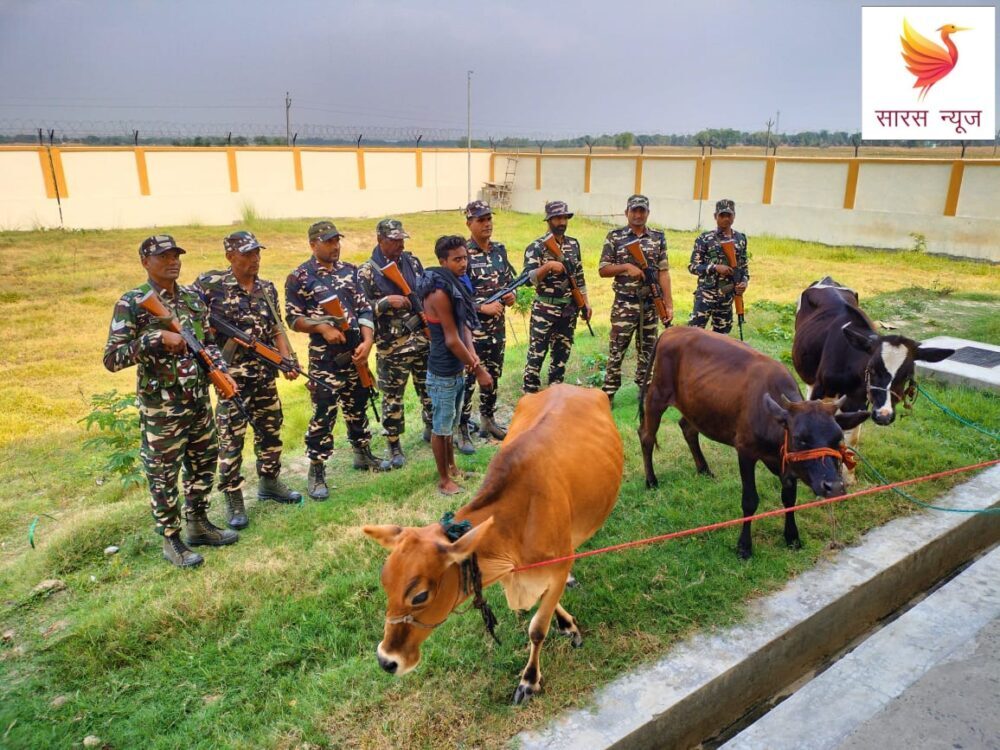 12 वीं बटालियन ए कंपनी बीओपी एसएसबी कैम्प पैक टोला के जवानों ने गुरुवार को पीलर संख्या 154 के नजदीक भारत नेपाल सीमा पार कर रहे मवेशी तस्करों को खदेड़ कर पकड़ लिया। जिसमें 03 मवेशियों के साथ एक तस्कर को धर दबोचा है। पकड़े गये मवेशियों को जब्त कर लिया गया है। गिरफ्तार तस्कर का नाम महेश सिंह(18) पिता राम सिंह ग्राम छलगाछी थाना छलगाछी जिला मोरंग नेपाल का बताया जा रहा है।