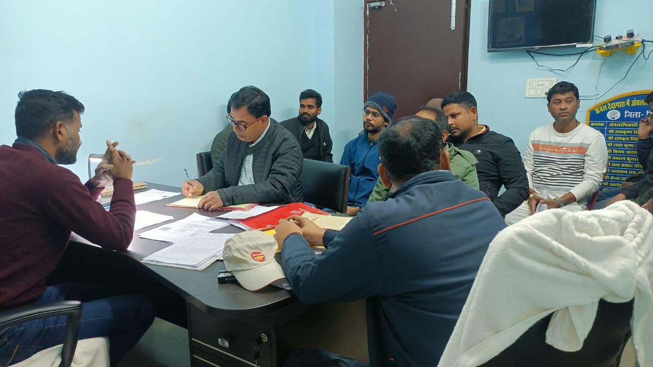 सीओ अजय चौधरी के नेतृत्व में शनिवार को टेढागाछ अंचल कार्यालय में सभी राजस्व कर्मचारियों के साथ एक बैठक आहूत की गई है। इसमें सभी पंचायत के राजस्व कर्मचारियों से राजस्व के साथ आधार से जमाबंदी को जोड़ने व ऑपरेशन रेन बसेरा के लिए निर्देश दिया गया। कार्यों के बारे में प्रगति के बारे में विस्तृत ब्योरा लिया। वहीं लंबित कार्यों को अद्यतन करने को लेकर सभी कर्मियों को एक सप्ताह के भीतर हर हाल में पूरा करने का आदेश दिया। बैठक में मुख्य रूप से राजस्व अधिकारी नजमुल हसन एवं सरकारी अमीन उपस्थित थे। सीओ अजय चौधरी ने सभी कर्मीयों को समय सीमा के अंदर अपना टारगेट पूरा करने की बात कही है। बैठक में मुख्य रूप से लगान रसीद परी, मार्जिन, दाखिल खारिज, भू मापी, एलपीसी, जाति, निवास, आय प्रमाण पत्र और भू संबंधित सभी समस्या अपने-अपने पंचायत में निपटारा करने का आदेश दिया, खास करके आपदा से जुड़े कई मामलों पर चर्चा की गई। अंचल अधिकारी अजय चौधरी ने बताया की टेढागाछ के 12 पंचायतों में लगभग 800 भूमिहीन परिवारों को सरकार की तरफ से तीन-तीन डिसमिल जमीन का बासकीत पर्चा दिया जाएगा जिसको लेकर हल्का कर्मचारी द्वारा जमीन चिन्हित कर लिया गया है। कुछ ही दिन बाद सभी भूमिहीन परिवारों को मिशन रेन बसेरा के तहत मकान बनाने के लिए जमीन मुहिया कराया जाएगा जिसको लेकर तैयारी पूरी कर ली गई है। सभी हल्का कर्मचारी को अपने पंचायत में शिविर लगाकर आधार से जमाबंदी जोड़ने की बात कही है। अंचल अधिकारी अजय चौधरी ने सभी कर्मी को कार्य में तेजी लाने की बात कही है। कार्य में लापरवाही बर्दाश्त नहीं की जाएगी।