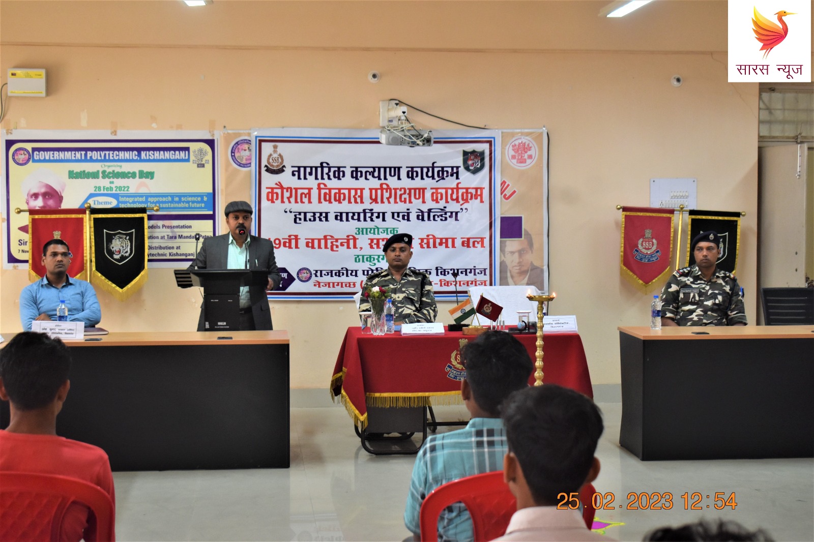 शनिवार को 19वीं वाहिनी सशस्त्र सीमा बल ठाकुरगंज द्वारा नागरिक कल्याण कार्यक्रम के अंतर्गत 21 दिवसीय (तीन सप्ताह) हाउस वायरिंग एवं वेल्डिंग कौशल विकास प्रशिक्षण कार्यक्रम का शुभांरभ किया गया। प्रखंड के बेसरबाटी के चुरलीहाट में अवस्थित राजकीय पॉलीटेक्निक किशनगंज में आयोजित उक्त कार्यक्रम की शुरुआत 19वीं वाहिनी सशस्त्र सीमा बल ठाकुरगंज के सहायक कमान्डेंट जय प्रकाश तथा राजकीय पॉलीटेक्निक के प्राचार्य प्रो चित्तरंजन कुमार ने संयुक्त रूप से दीप प्रज्वलित कर किया। उसके उपरांत मंच संचालक प्रो उमेश कुमार (सिविल इंजिनियर) द्वारा सहायक कमान्डेंट जय प्रकाश अभिनन्दन कर पूरी वाहिनी को धन्यवाद ज्ञापित किया कि उक्त प्रशिक्षण के लिए इस संस्थान को चुना गया। वहीं कार्यक्रम में शामिल लाभुक सीमावर्ती छात्रों से परिचय प्राप्त किया गया।