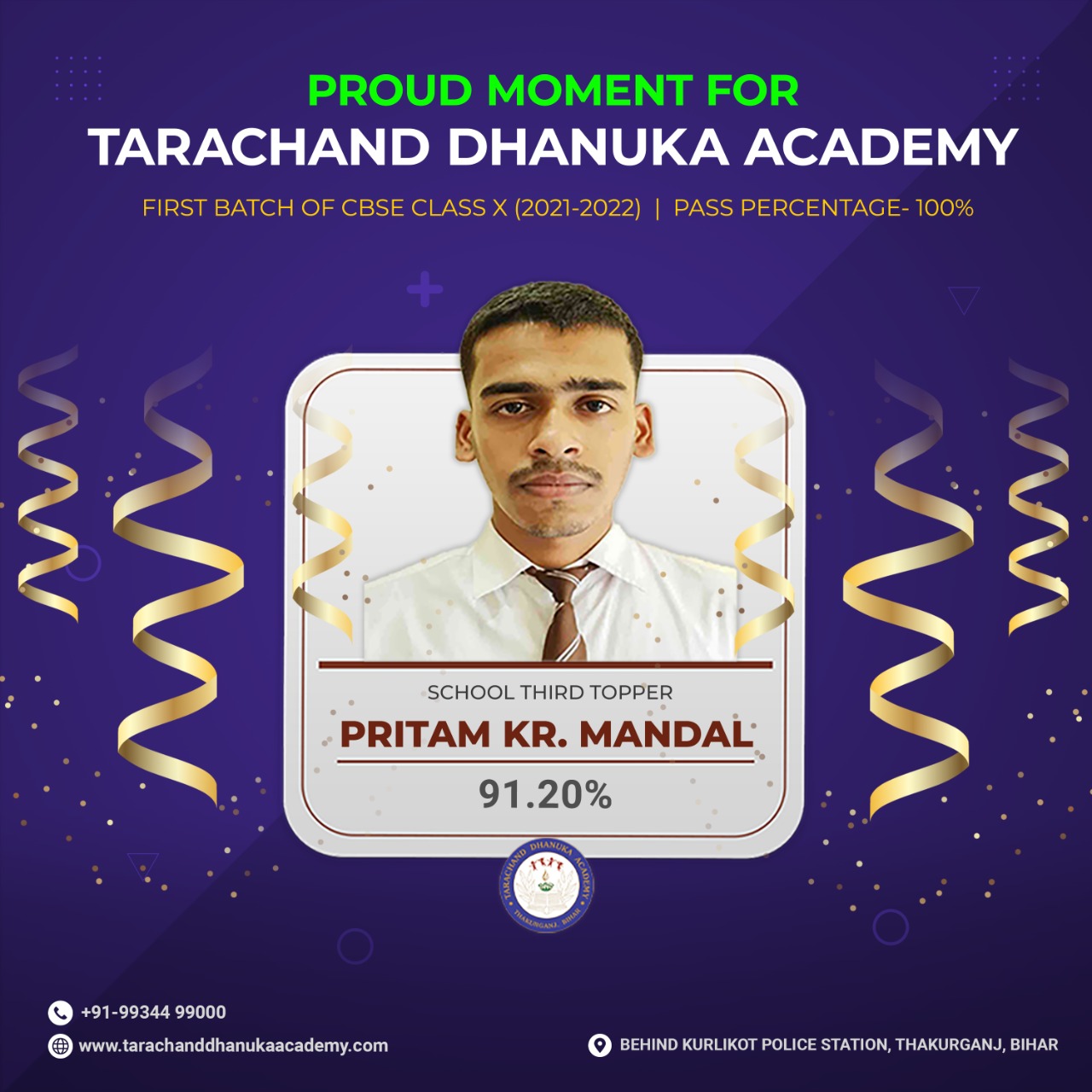 तीसरे स्थान पर 91.20 प्रतिशत अंको के साथ रहे प्रीतम कुमार मंडल