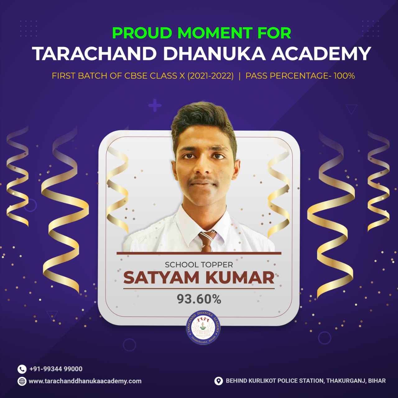सीबीएससी की दसवीं परीक्षा में पास प्रतिशत के मामले में ताराचंद धानुका अकेडमी, पटना रीजन के बेस्ट स्कूल में शामिल हो गया है। वैसे तो इसका श्रेय सभी बच्चो को है, पर कुछ बच्चों ने तो जबरदस्त अंक लाकर टीडीए और पुरे ठाकुरगंज क्षेत्र का नाम रोशन किया है। निचे देखिये उन बच्चो की तस्वीर।