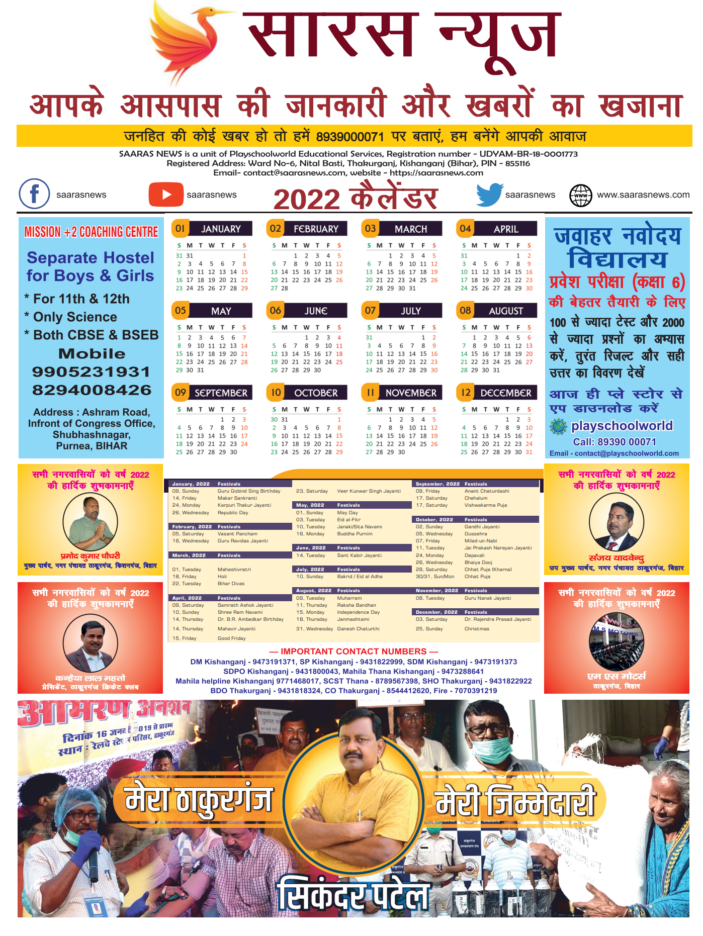 ठाकुरगंज ठाकुरगंज के लिए सारस न्यूज़ का 2022 कैलेंडर लांच हुआ। यदि आप तक कैलेंडर नहीं पहुंचा है तो हमें बतायेँ। सारस न्यूज़ Mar 1, 2022 0 Post Views: 767 🔊 सुनें ⏸️ रोकें ⏹️ बंद करें टीम सारस न्यूज़, ठाकुरगंज। टीम सारस न्यूज़, ठाकुरगंज। कैलेंडर