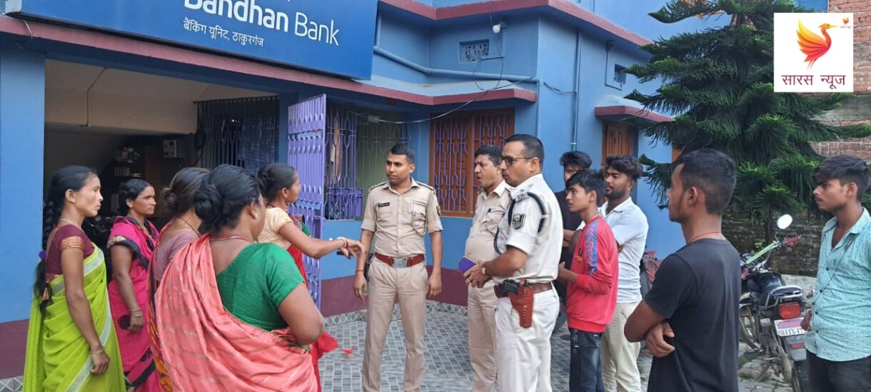 मंगलवार को ठाकुरगंज थाना क्षेत्र अंतर्गत नगर के ब्लॉक रोड चकबंदी ऑफिस के सामने बंधन बैंक से 97 हजार रुपये निकालकर जा रही महिला से बाइक सवार अपराधियों ने दिनदहाड़े छिनतई की घटना को अंजाम दिया है। घटना संध्या करीब 5 बजे की बताई जा रही है। घटना की सूचना मिलते ही ठाकुरगंज के थानाध्यक्ष सतीश कुमार हिमांशु ने अपर थानाध्यक्ष कुंदन कुमार व प्रशिक्षु सब इंस्पेक्टर विपिन कुमार सिंह सहित पुलिस दल बल के साथ मौके पर पहुंच स्थिति का जायजा लिया। इस दौरान पुलिस अधिकारियों ने पीड़िता उर्मिला देवी का बयान लिया। जिसमें पीड़िता ने थानाध्यक्ष के समक्ष यह बयान दिया कि वह अपने पति परेश सिंह के साथ अपने घर चुरली पंचायत के भैसलोटी गांव के तीन चार महिलाओं के साथ ग्रुप लोन लेने के लिए नगर के वार्ड नं दो फाराबाड़ी स्थित बंधन बैंक पहुंची। करीब साढ़े चार बजे उन्हें लोन की राशि एक लाख रुपए में से 97 हजार रुपए नगद दिए गए। राशि मिलते ही उनके पति कुछ जरूरी काम के लिए बाजार निकल गए और उर्मिला देवी गांव की महिलाओं के साथ टोटो में सवार घर के लिए रवाना हो गईं। इसी बीच जैसे ही सब लोग ब्लॉक रोड में स्थित पुराना चकबंदी ऑफिस के पास पहुंचे वैसे ही बाईक पर सवार दो झपटमार अपराधियों ने पॉलिथीन बैग में रखे बैंक लोन की कुल राशि 97 हजार छीनकर फरार हो गए। उर्मिला देवी का कहना है की उन्होंने अपने पैसे रखे थैली को कसकर पकड़ रखा था, पर चलती टोटो से उन्हें नीचे गिरा कर बदमाश पैसे वाला बैग छीन कर भाग गया। वहीं सड़क पर गिरने के कारण पीड़ित महिला को कई जगहों पर चोटें भी आईं। इस क्रम में पीड़ित महिला के साथ आए अन्य महिलाओं ने बताया कि इन अपराधियों को बैंक के इर्द-गिर्द काफी समय तक मंडारते हुए देखा गया था और वह अपराधी बैंक से ही रेकी कर रहा था।