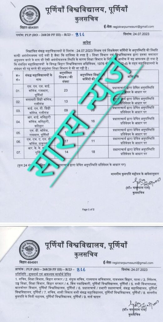 इस संबंध में पूर्णिया विश्वविद्यालय, पूर्णिया के कुलसचिव डॉ घनश्याम राय ने कुलपति का निर्देश का हवाला देते हुए पत्रांक – पी यू पी (आर ओ -268/20 पी एफ III ) – आर / 23- 816, दिनांक: 24.07.2023 के माध्यम से कहा है कि उपरोक्त अंकित संबद्ध महाविद्यालयों में 24 जुलाई 2023 को शिक्षक एवं शिक्षकेतर कर्मियों के अनुपस्थिति की स्थिति काफी असंतोषजनक पाई गयी है जैसा कि तालिका से स्पष्ट है। शिक्षा विभाग एवं विश्वविद्यालय द्वारा इसका लगातार अनुश्रवण करने के बाद भी ऐसी असंतोषजनक स्थिति के कारण शिक्षा विभाग के निर्देश के आलोक में यह आवश्यक हो गया है कि संबंधित महाविद्यालयों के विरुद्ध बिहार विश्वविद्यालय अधिनियम, 1976 की धारा 21 (2-d) के तहत महाविद्यालयों के संबंधन को रद्द करने की अनुशंसा शिक्षा विभाग से की जाए। उन्होंने बताया कि पूर्णिया विश्वविद्यालय के अधीन 24 संबद्ध कॉलेजों के प्रधानाचार्य द्वारा प्रेषित शिक्षकों और शिक्षकेत्तर कर्मियों की अनुपस्थिति प्रतिवेदन के आधार पर उक्त कार्रवाई की गई हैं। शिक्षकों और शिक्षकेत्तर कर्मियों की उपस्थिति में सुधार को ले राज्यस्तरीय टीम के द्वारा निरंतर कॉलेजों की जांच की जा रही थी।